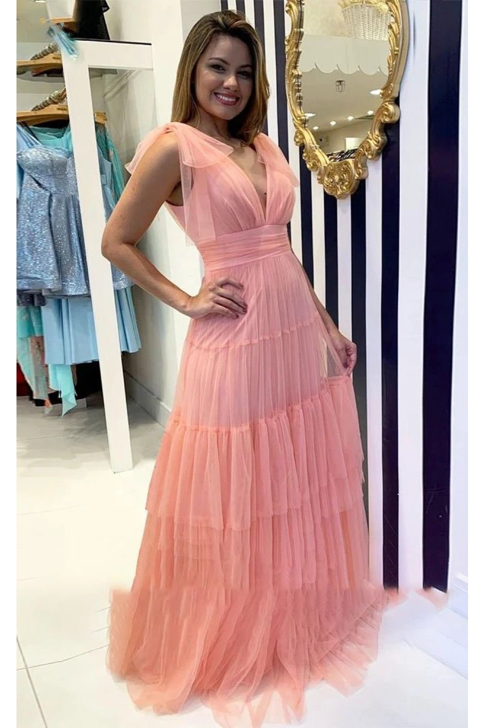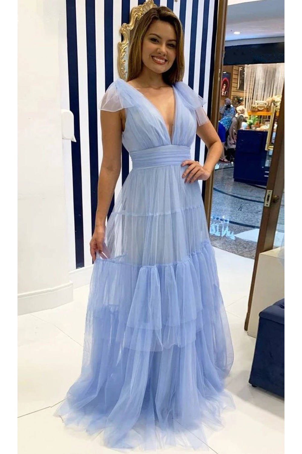 Long Blue Deep V Neck Tulle Prom Dresses 801417