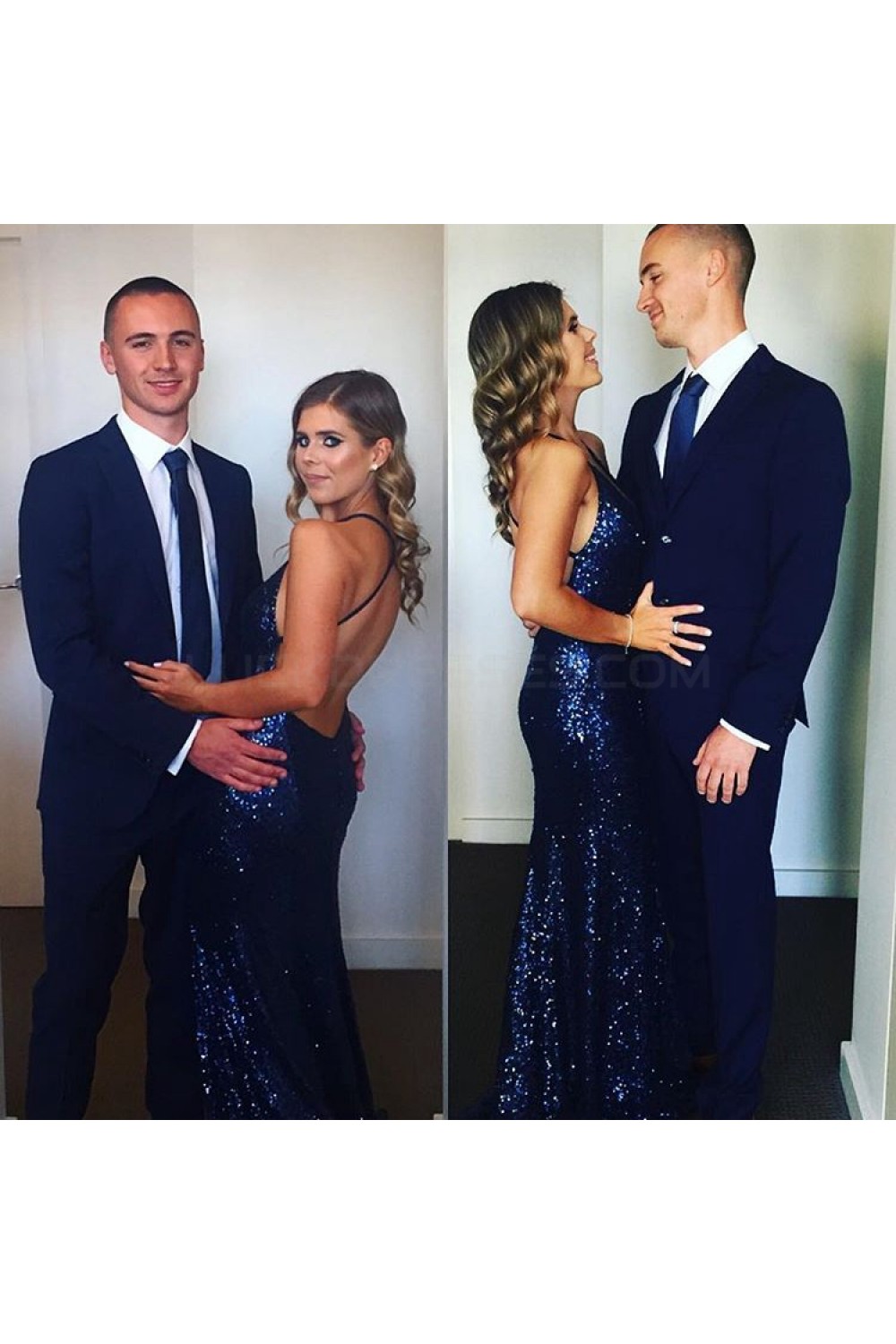 Long Blue Mermaid Sequins V-Neck Prom Formal Evening Party Dresses 3021111