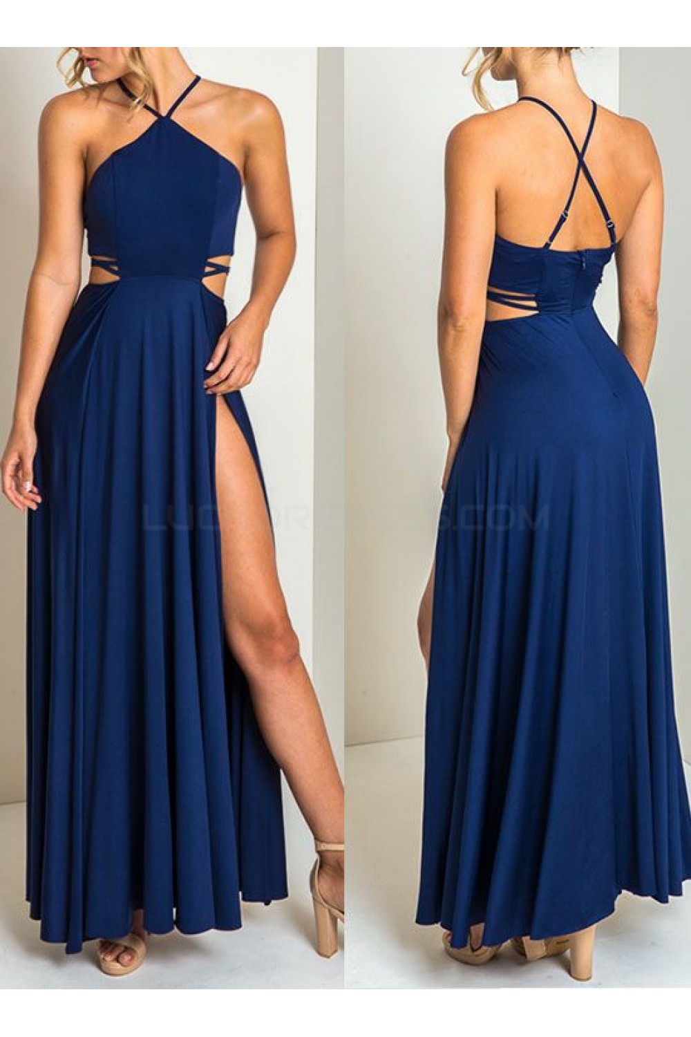 Long Blue Spaghetti Straps Chiffon Prom Formal Evening Party Dresses 3021419
