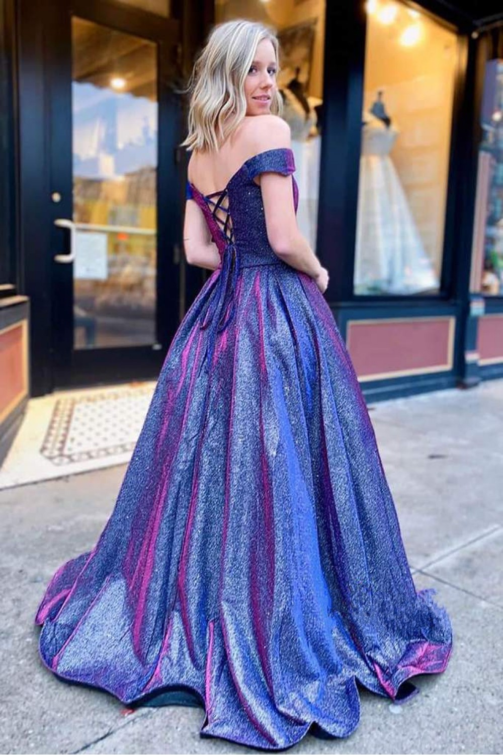 Long Blue Sparkly Off the Shoulder Prom Dress Formal Evening Gowns 901334
