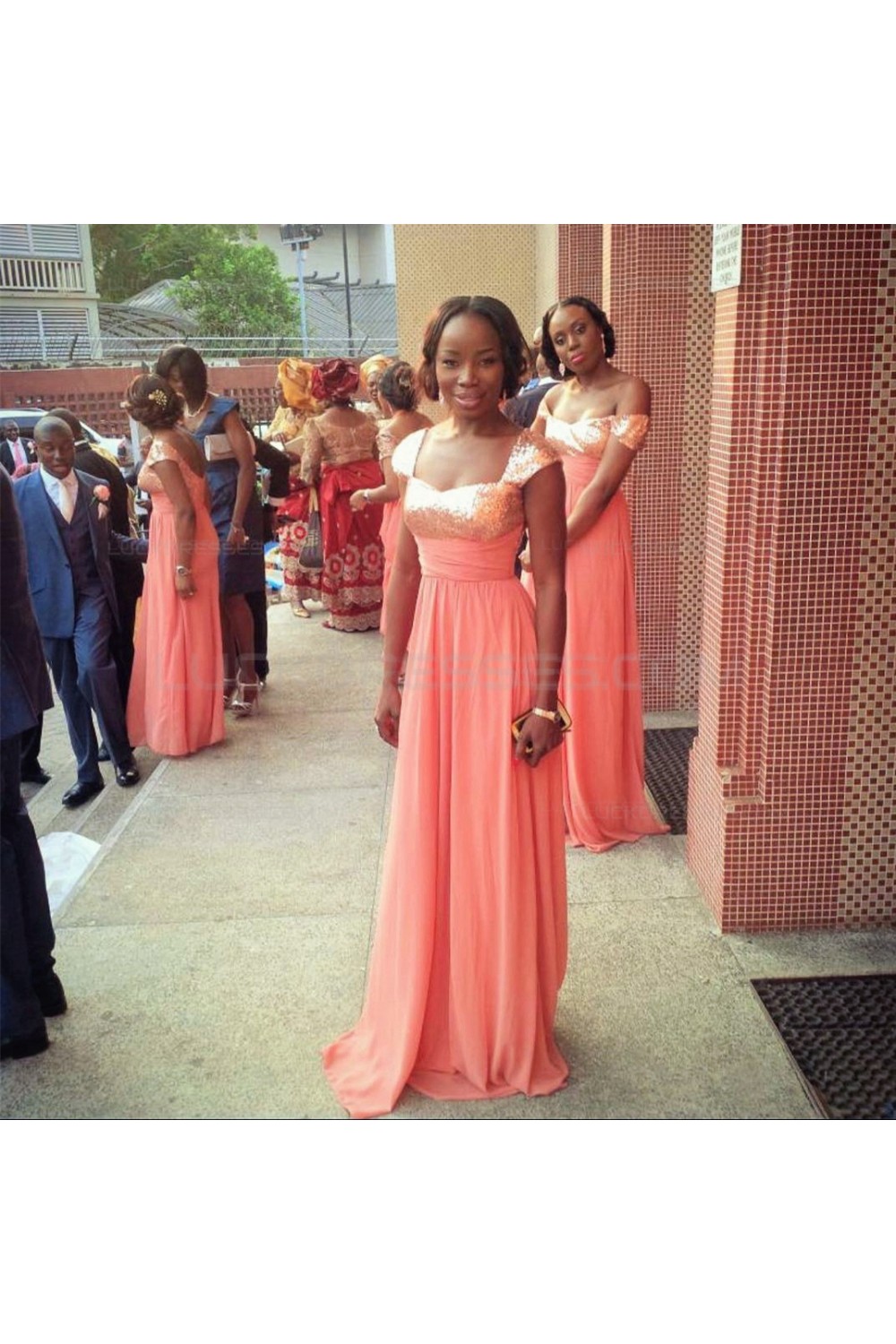 Long Coral Sequins Chiffon Wedding Guest Dresses Bridesmaid Dresses 3010240