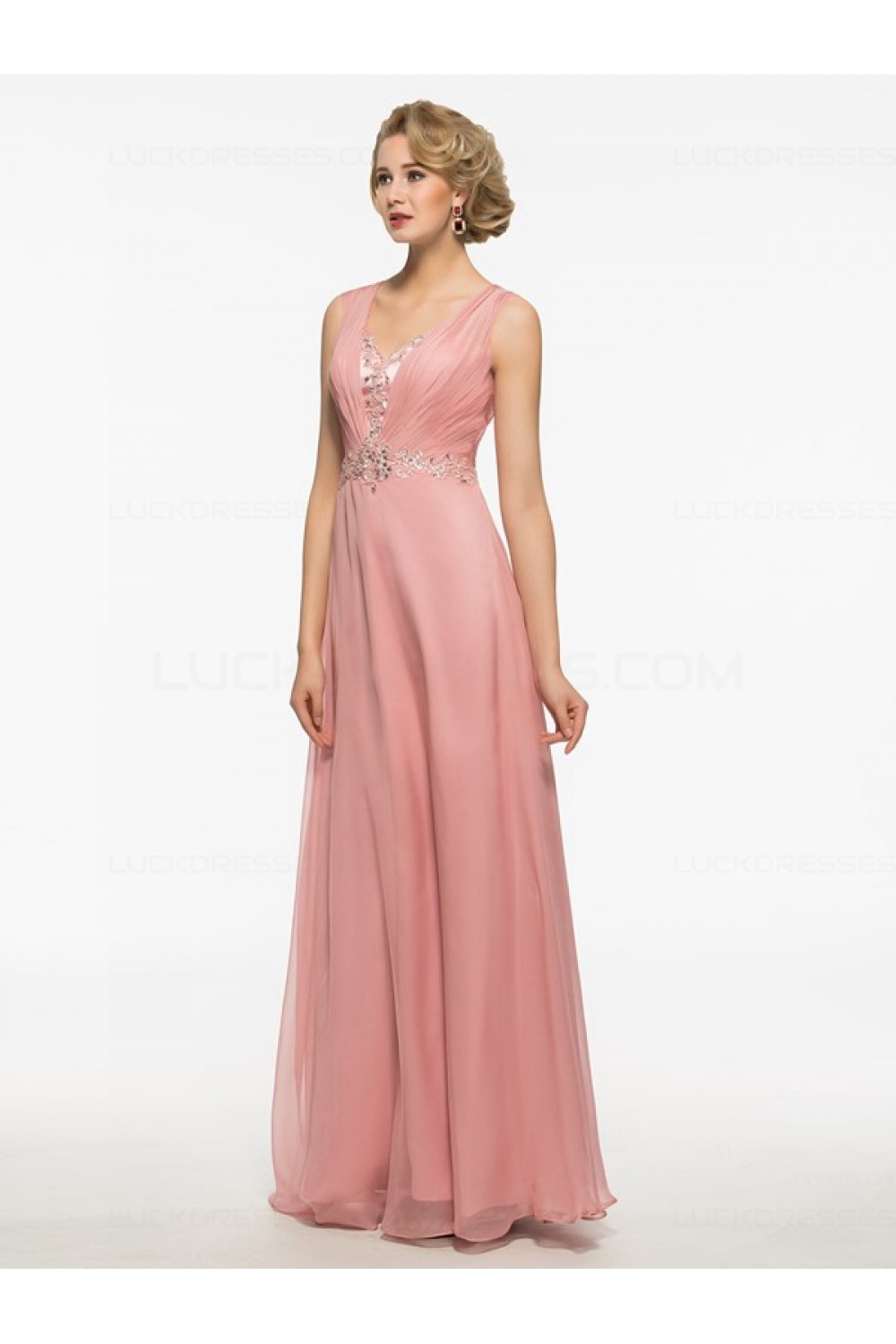 Long Pink Lace Chiffon V-Neck Mother of The Bride Dresses 3040024