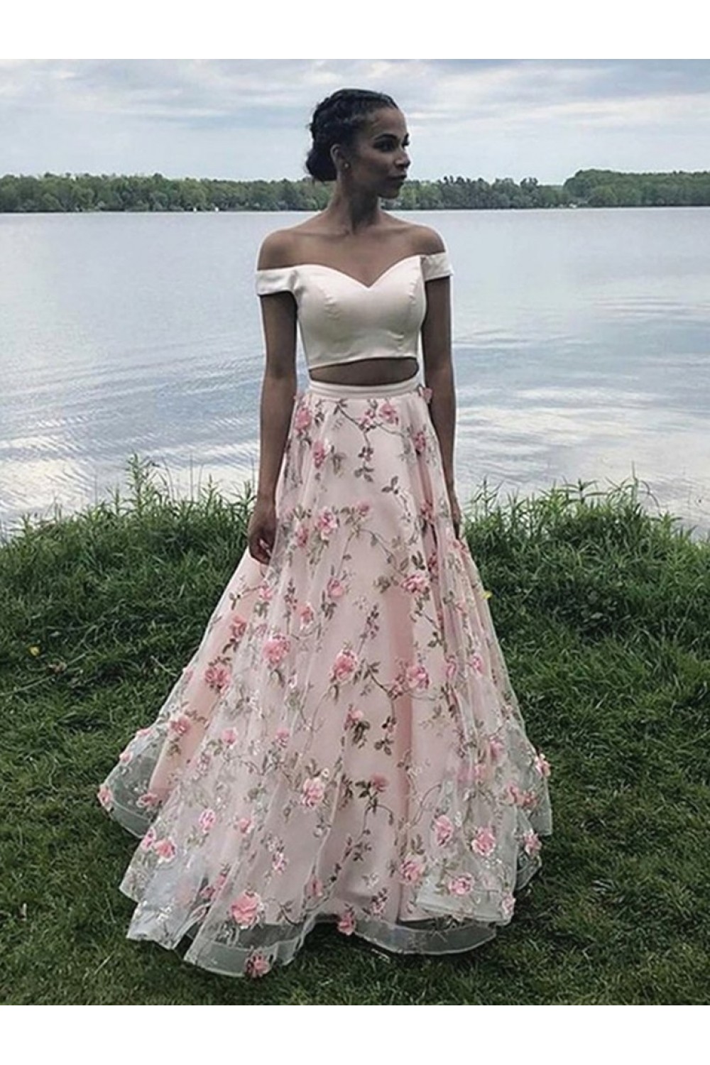 Long Pink Two Pieces Embroidered Prom Dresses Formal Evening Gowns 901051