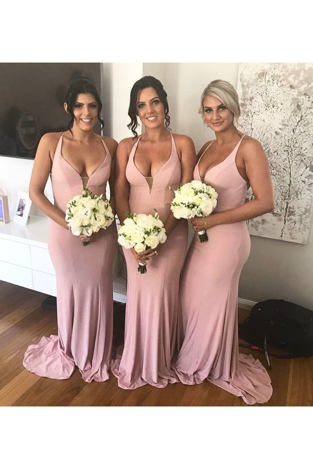 Long Pink V Neck Floor Length Bridesmaid Dresses 902051