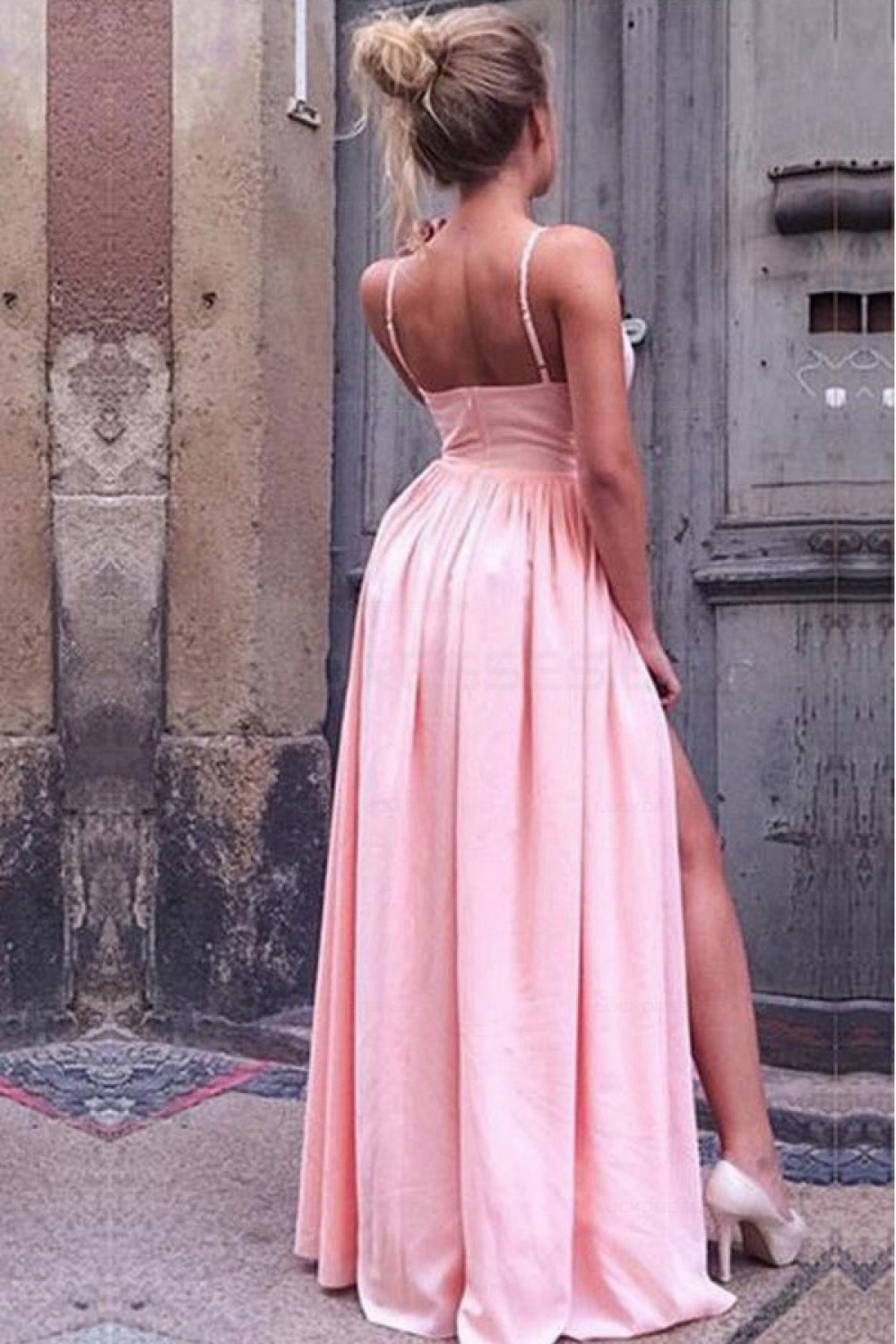 Long Pink V-Neck Prom Evening Formal Dresses with Side Slit 3021542