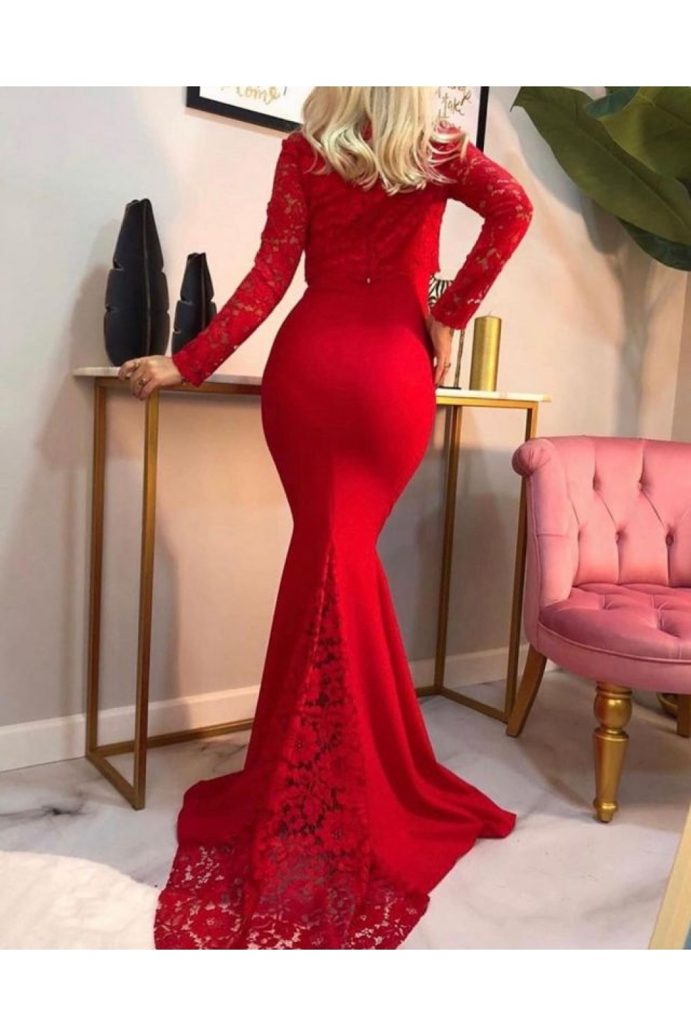 Long Red Mermaid Lace Long Sleeves Prom Dress Formal Evening Gowns 901304