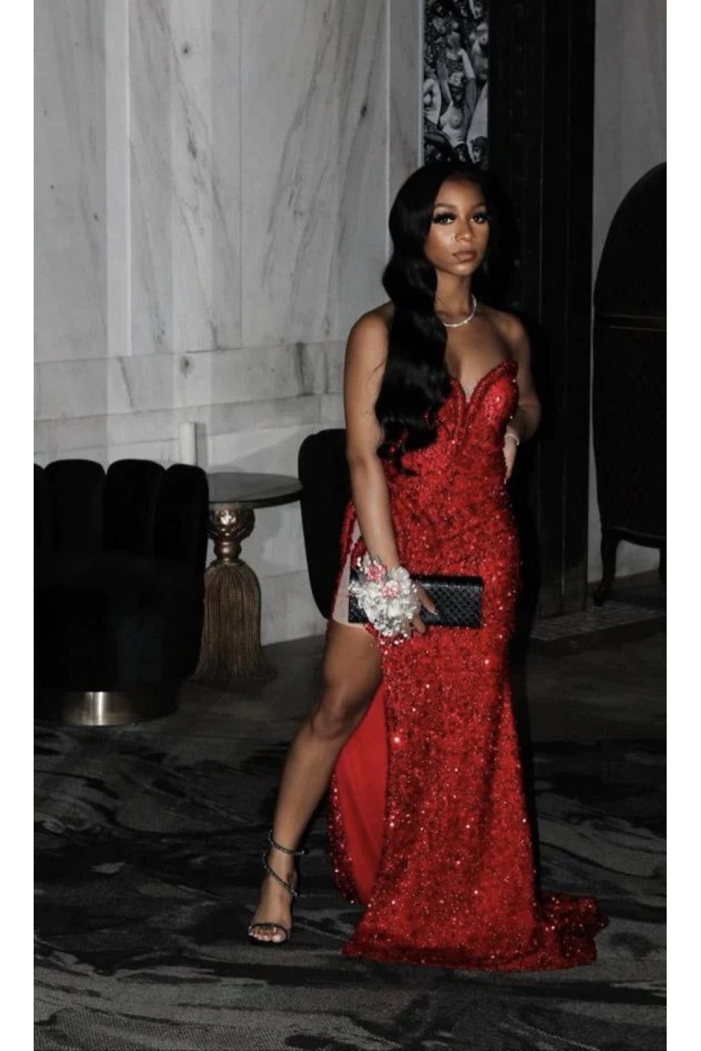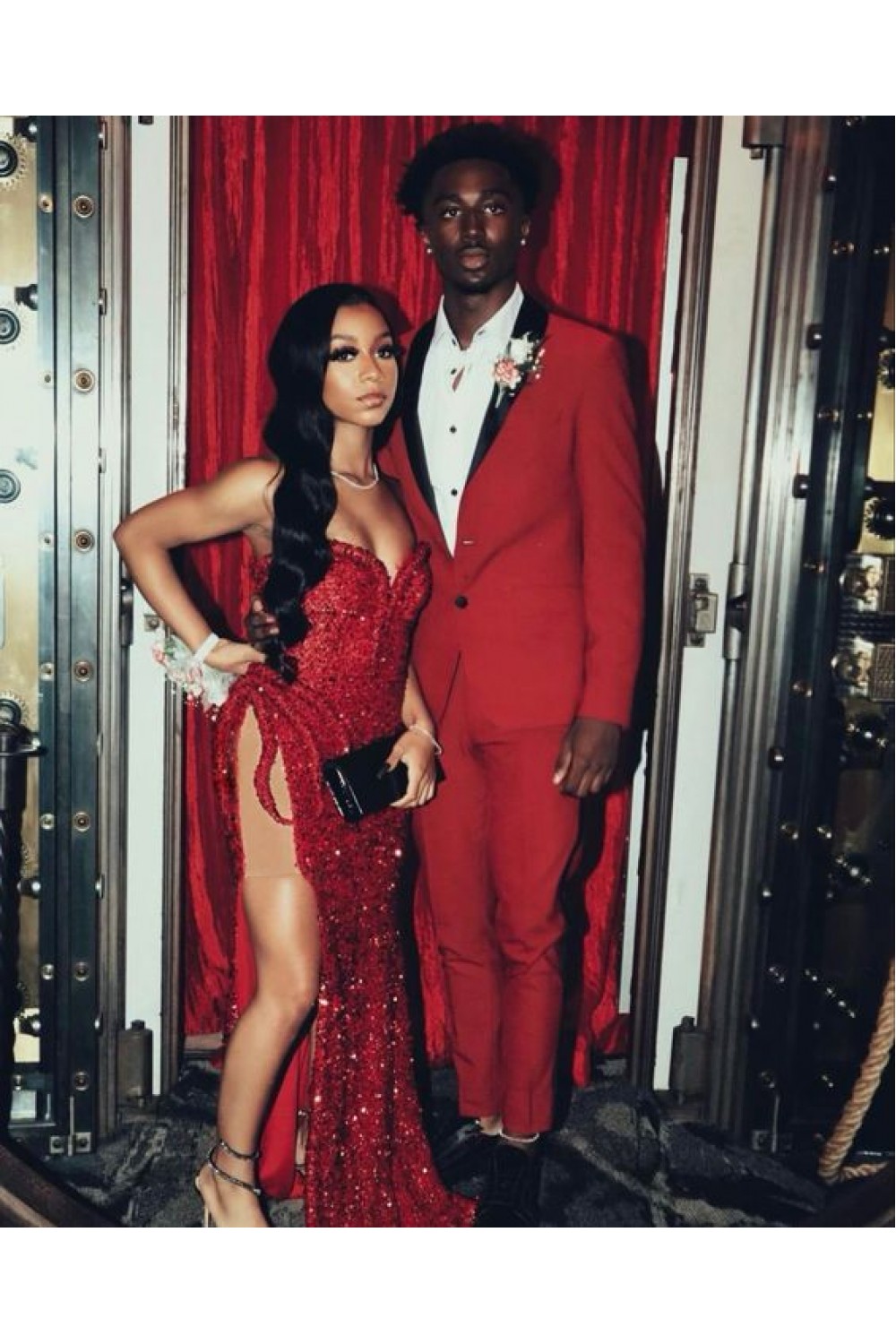 Long Red Mermaid Sequins Prom Dresses with High Slit 801460