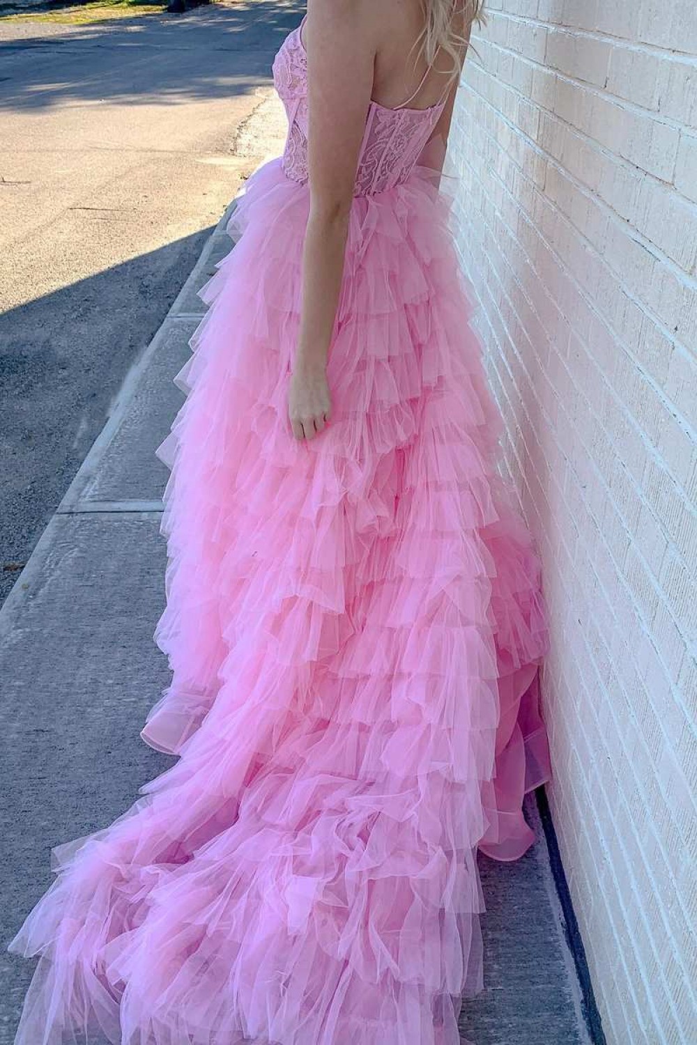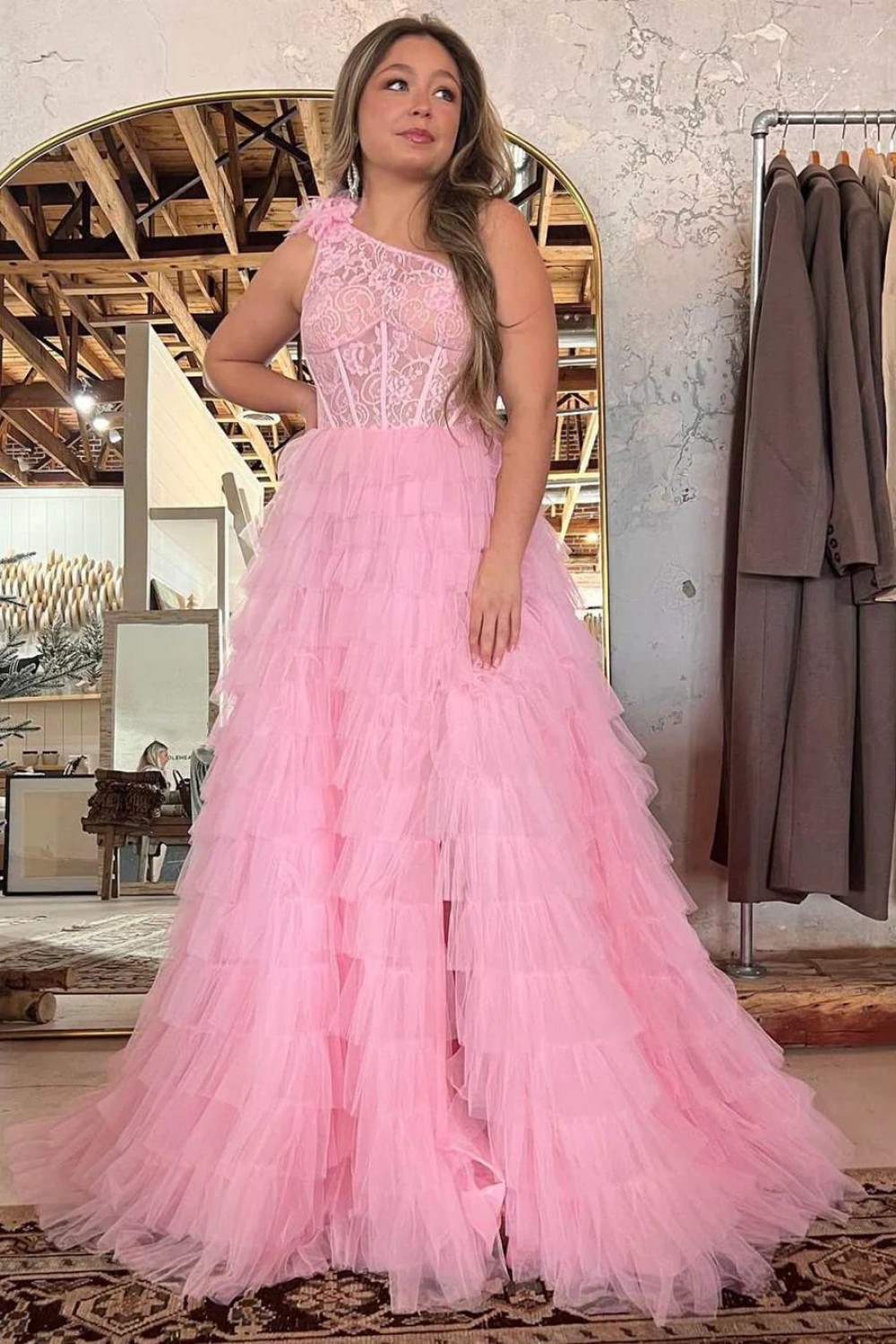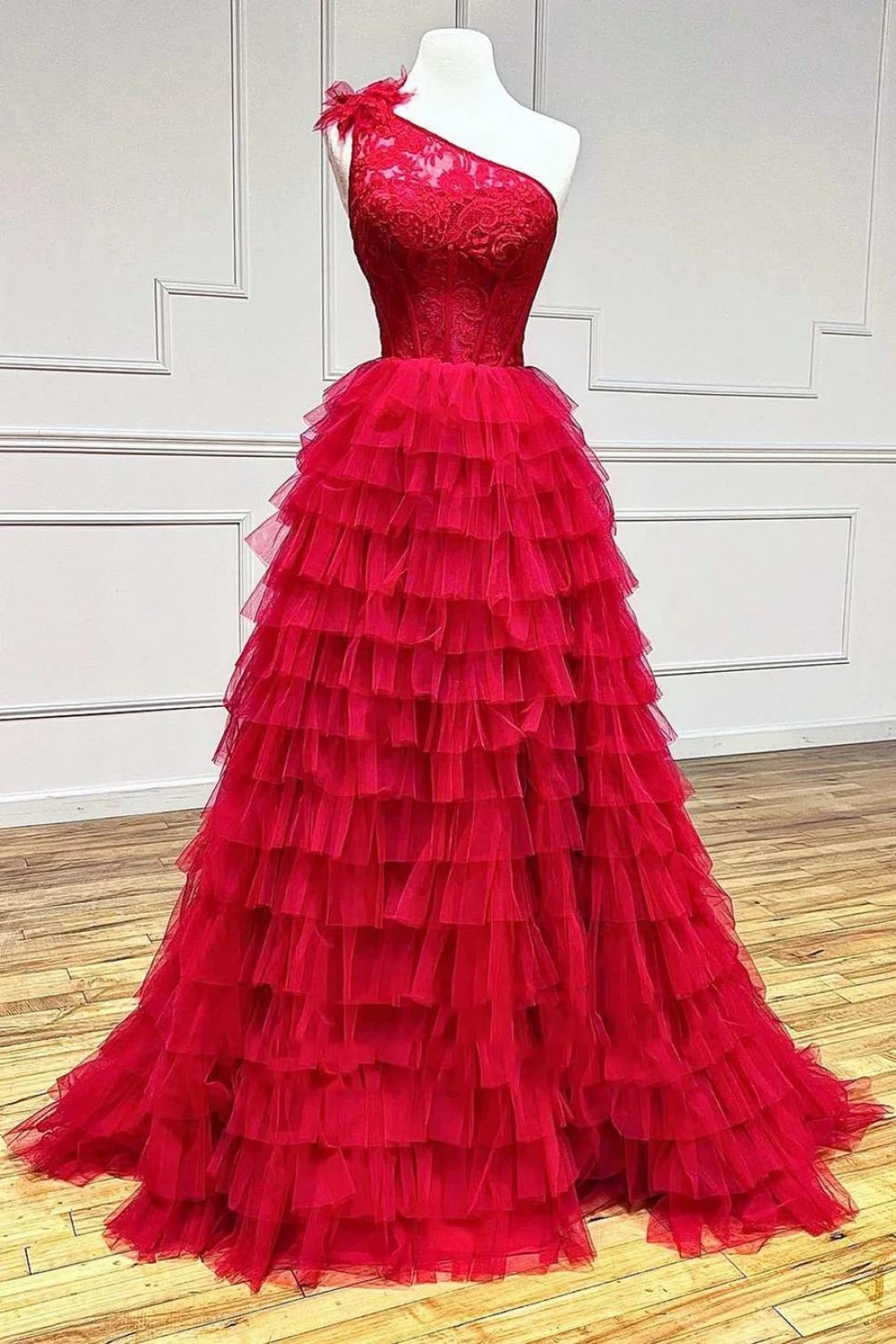Long Red One Shoulder Lace and Tulle Prom Dresses 801032