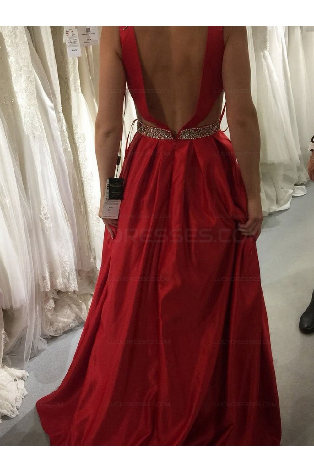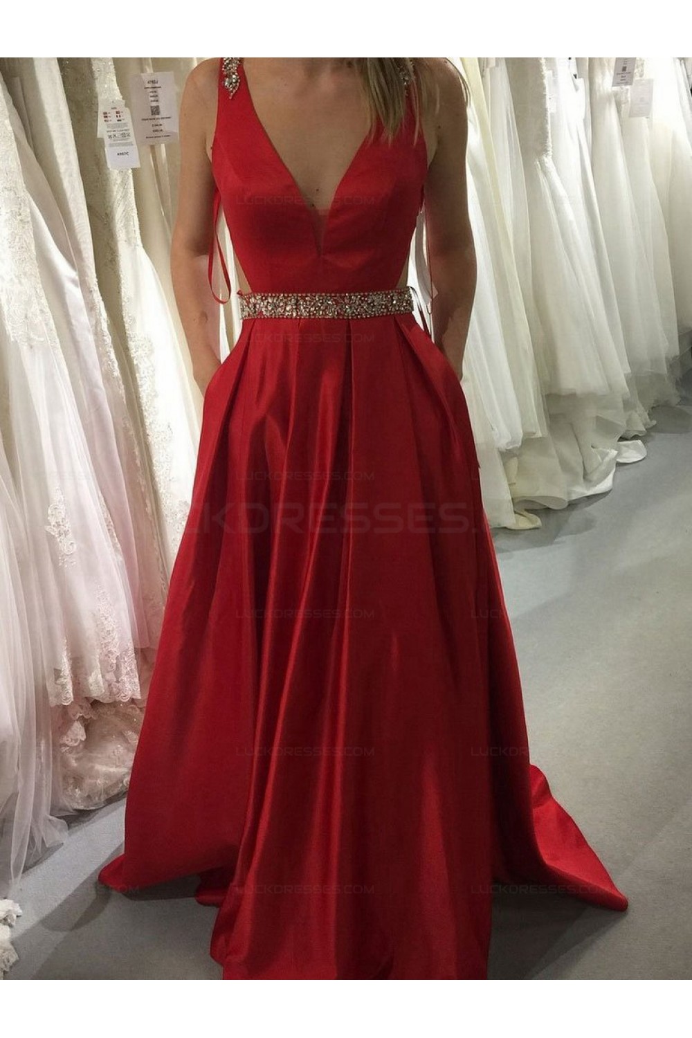 Long Red V-Neck Beaded Prom Evening Formal Dresses 3021556