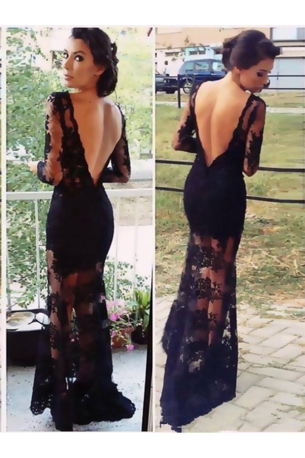 Long Sleeve Lace Black Low V-Back Evening Formal Party Dresses ED010727