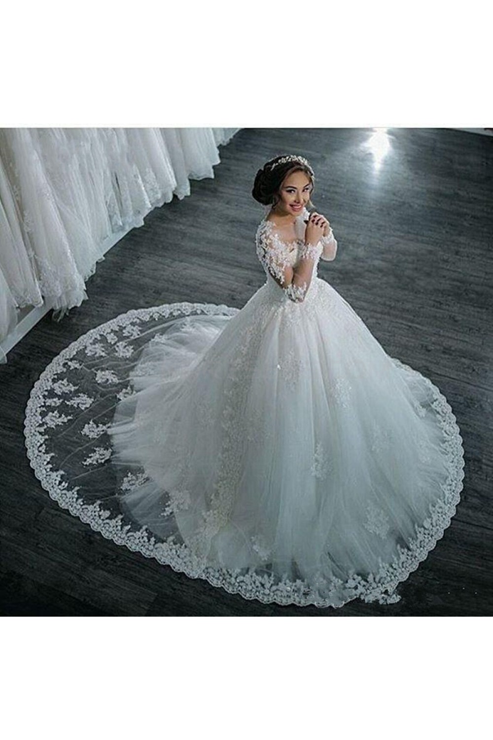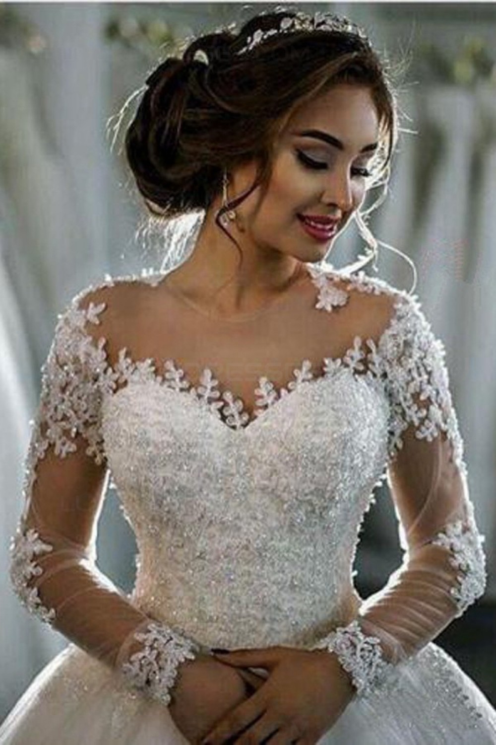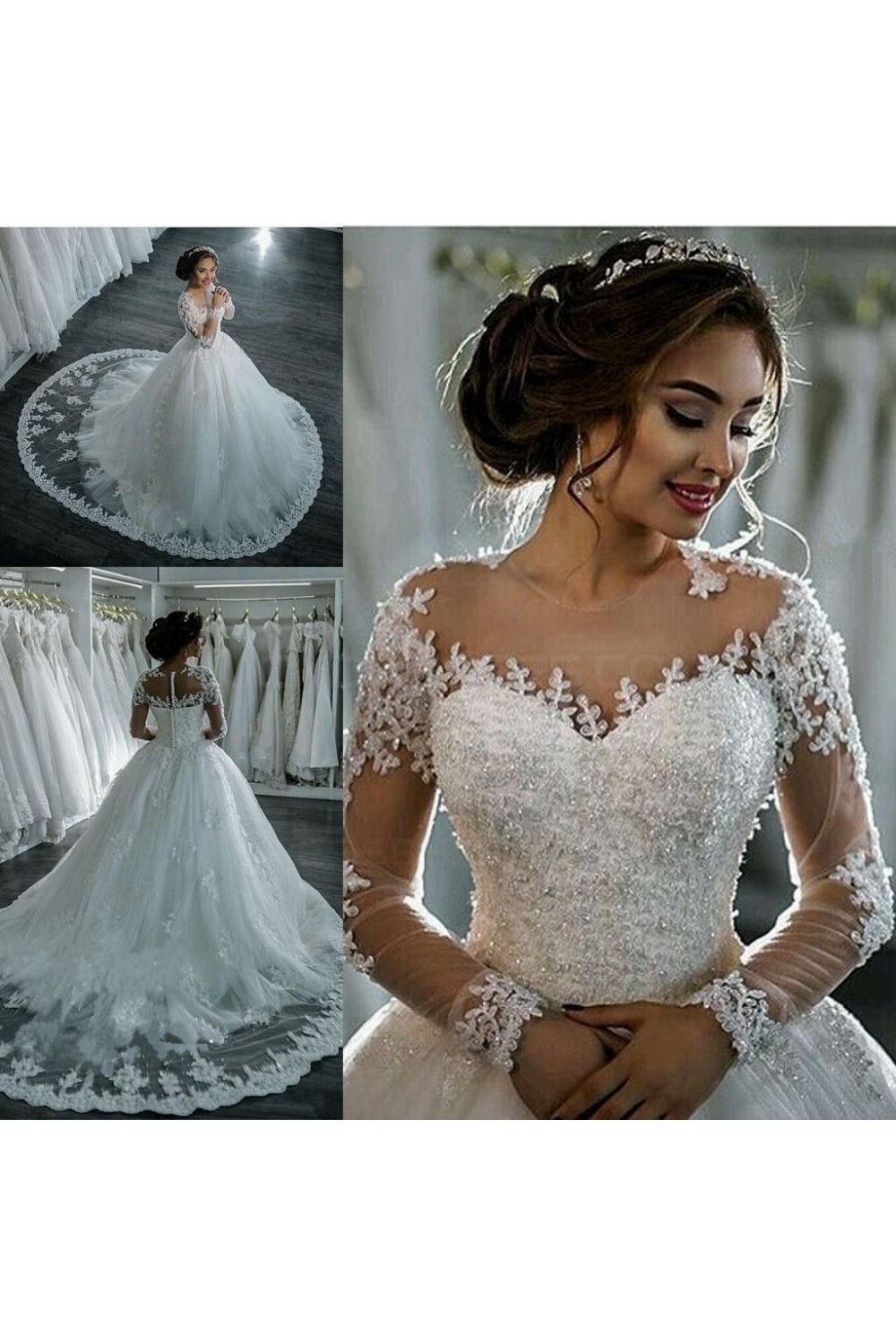Long Sleeves Illusion Neckline Lace Wedding Dresses Bridal Gowns 3030214