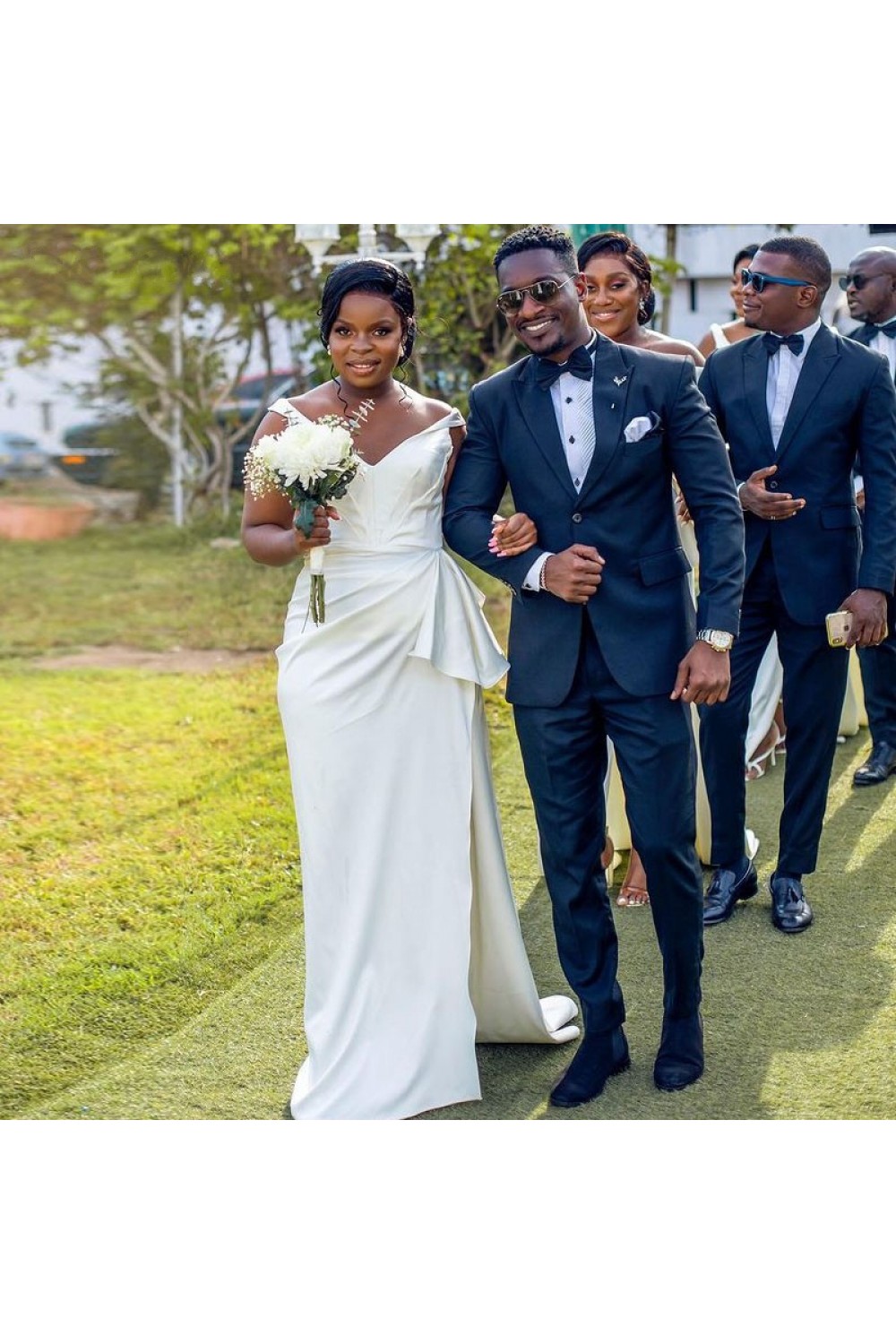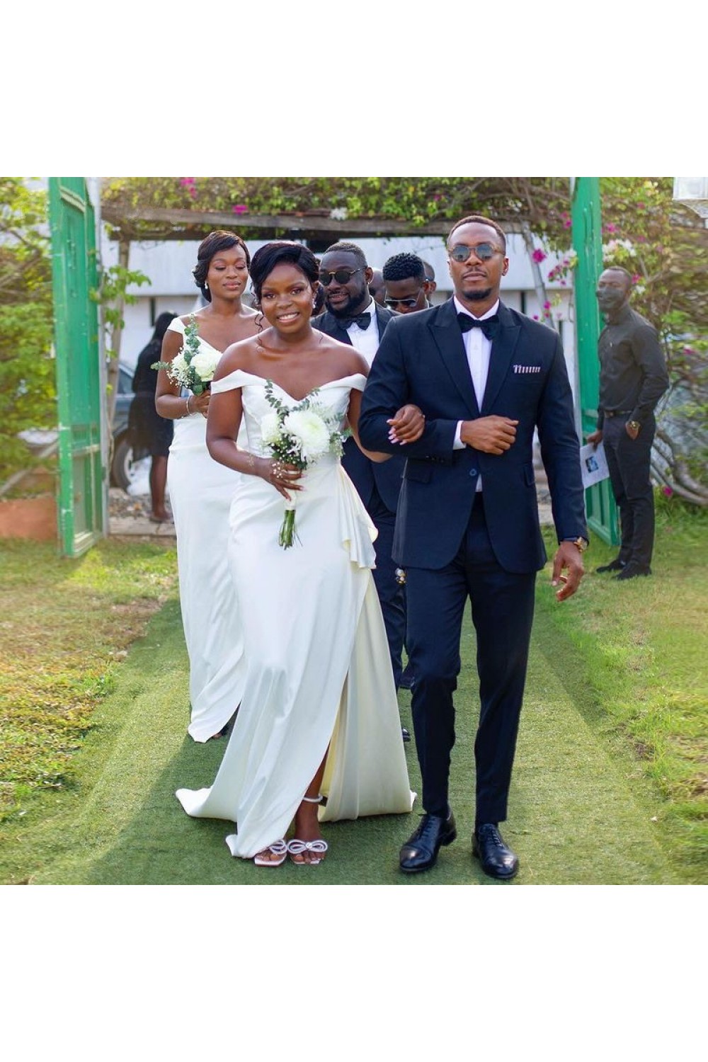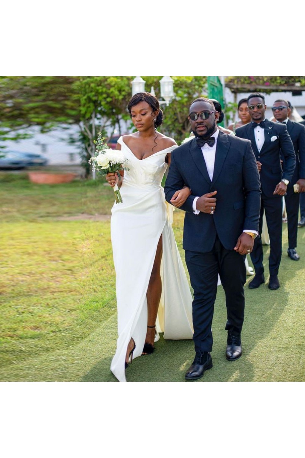 Long White Sheath Off the Shoulder Bridesmaid Dresses with Slit 902306