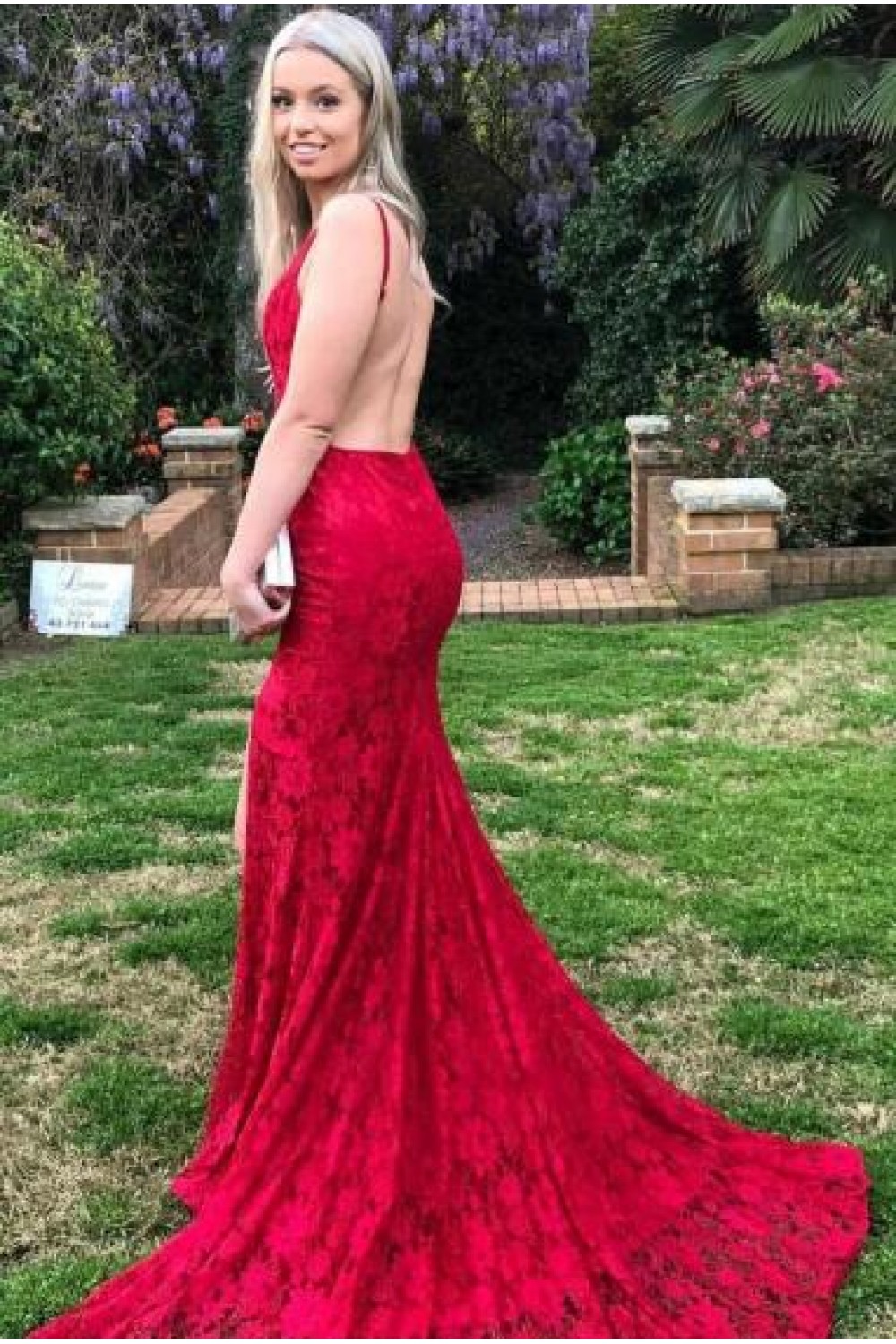 Mermaid Backless Lace V-Neck Long Prom Dress Formal Evening Dresses 601559