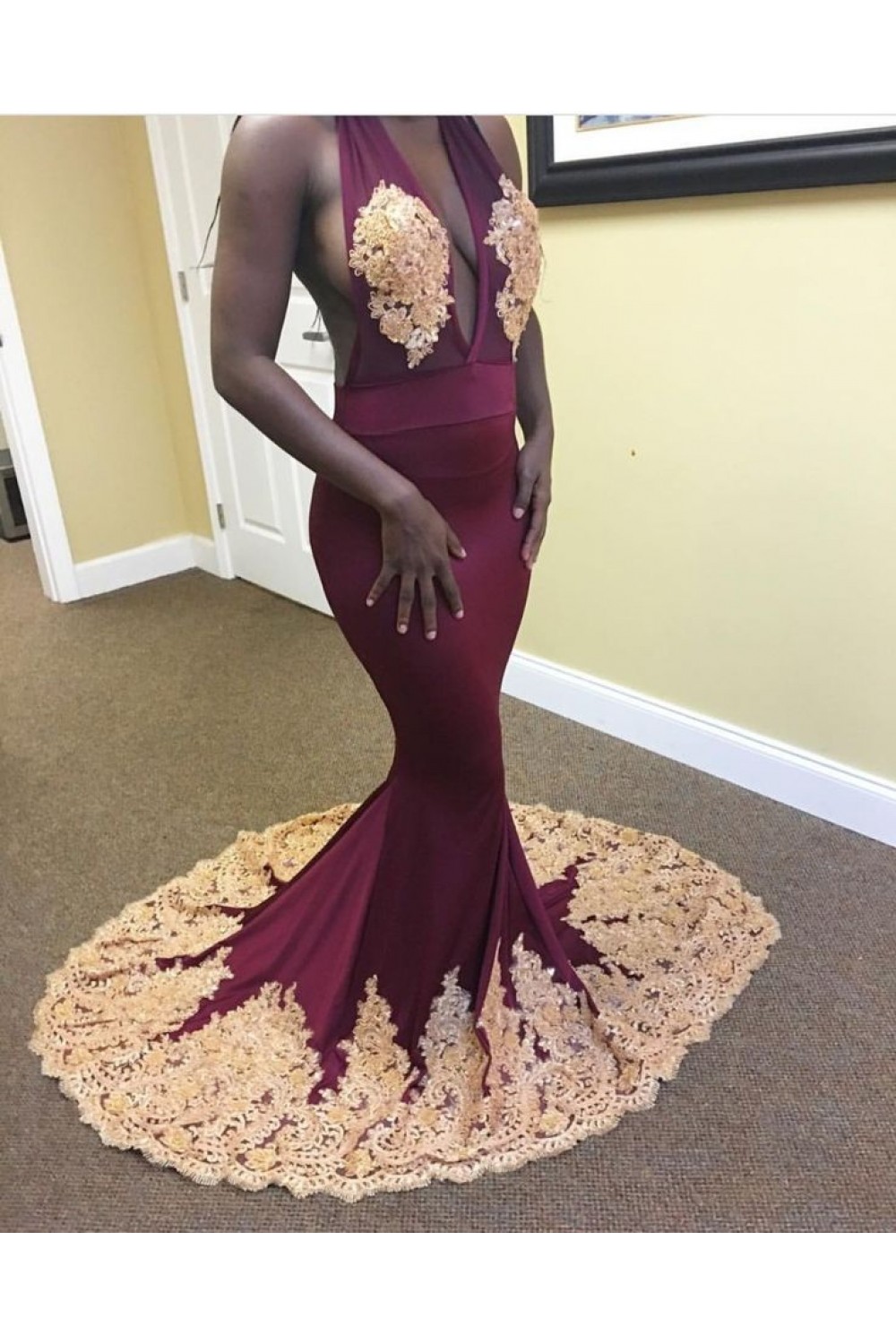 Mermaid Burgundy Lace Long Prom Dresses 801321
