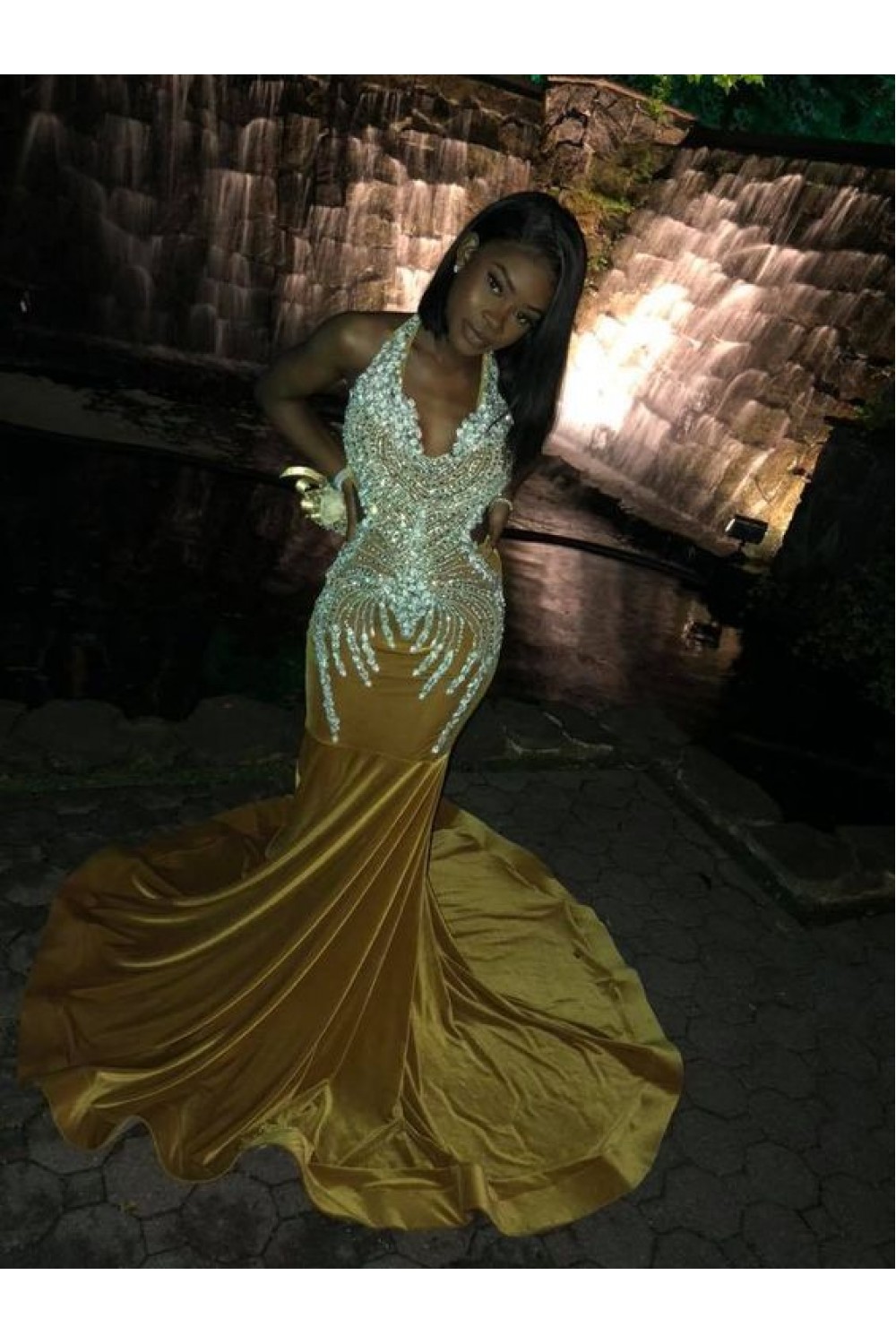 Mermaid Gold Beaded Long Prom Dresses 801327