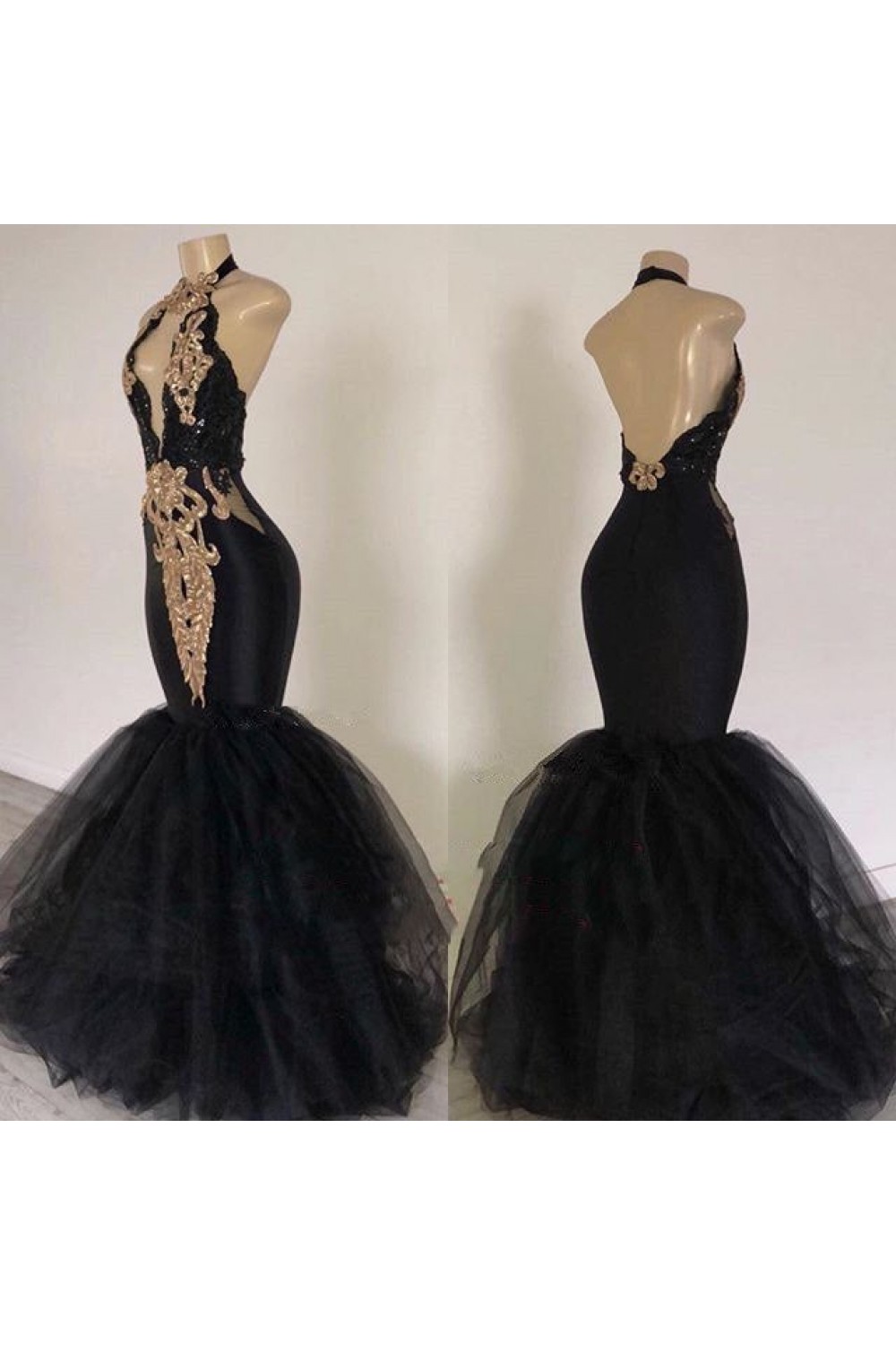 Mermaid Gold Lace Appliques Long Black Prom Dresses 801334