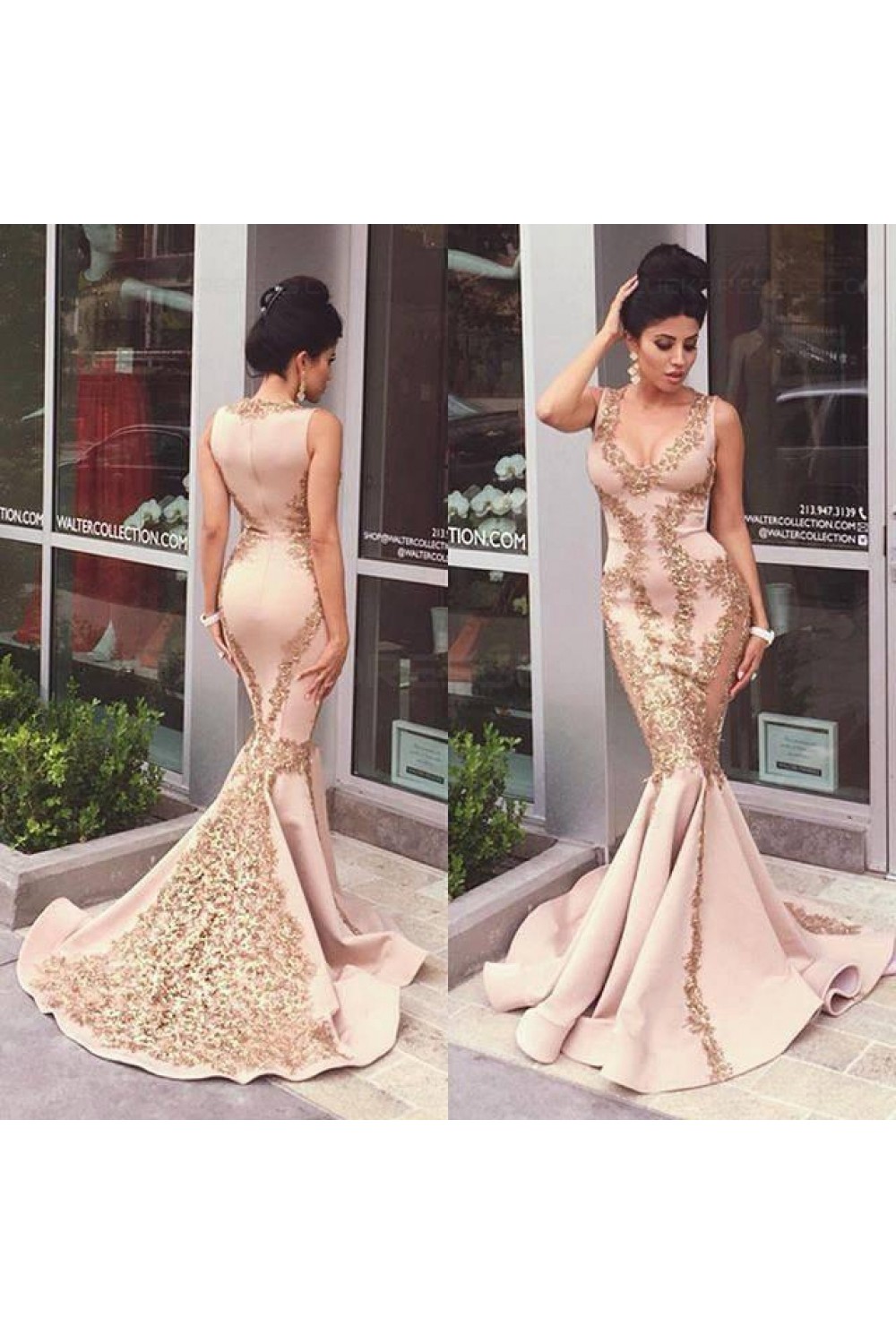 Mermaid Gold Lace Appliques Prom Dresses Party Evening Gowns 3020475