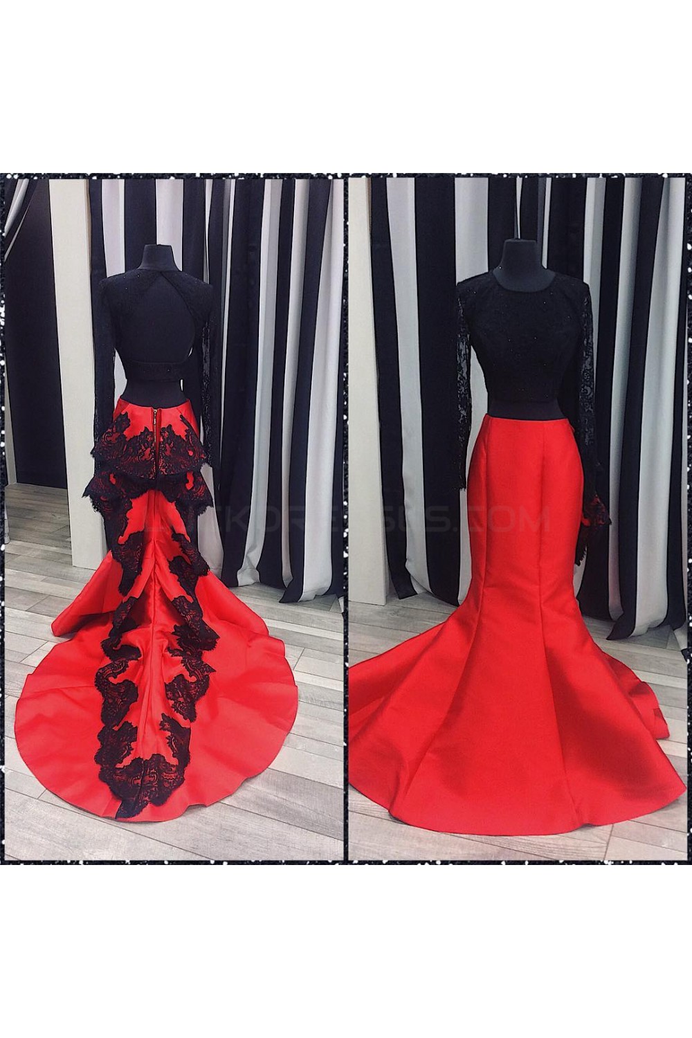 Mermaid Long Sleeves Lace Black White Prom Formal Evening Party Dresses 3021169