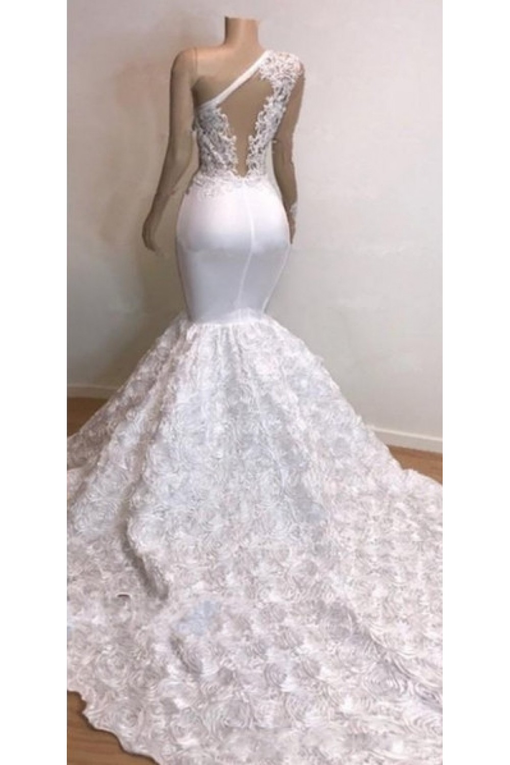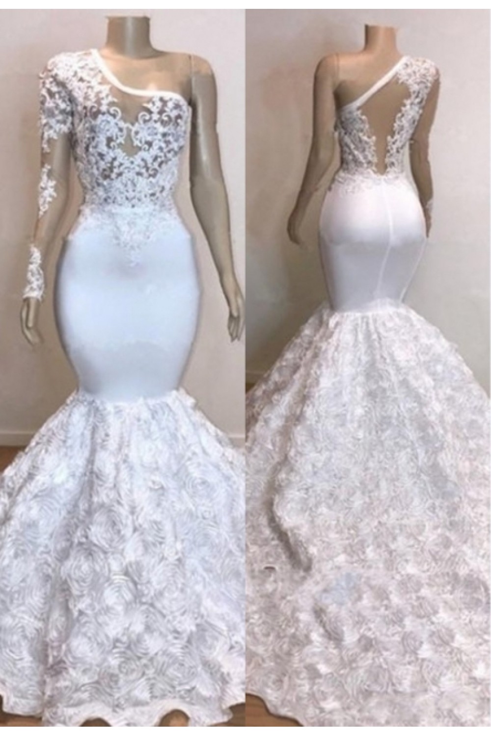 Mermaid Long White One Shoulder Lace Appliques Prom Dresses 801347