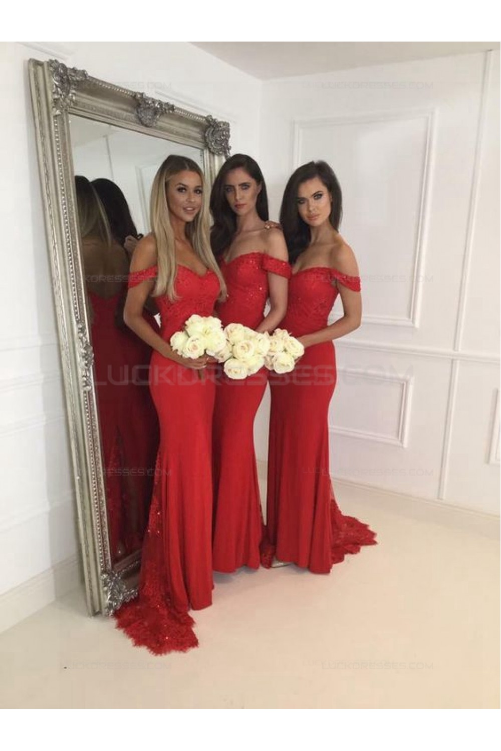 Mermaid Off-the-Shoulder Long Red Lace Wedding Guest Dresses Bridesmaid Dresses 3010228