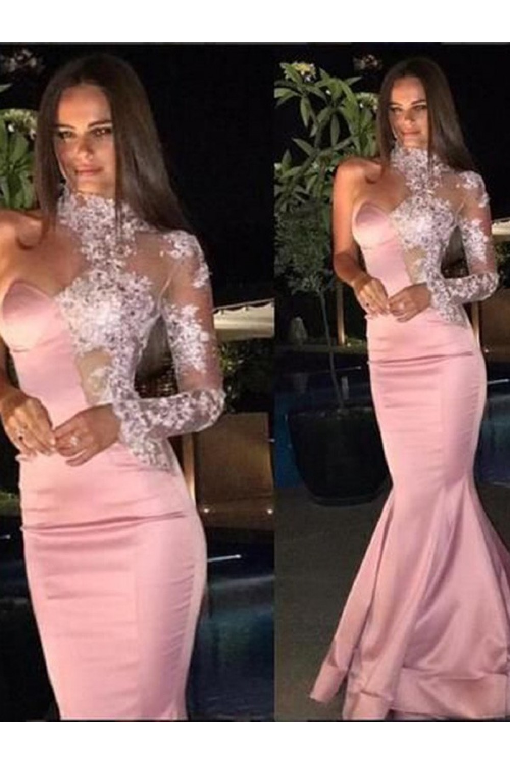 Mermaid One Sleeves Long Pink Lace Prom Dress Formal Evening Dresses 601710