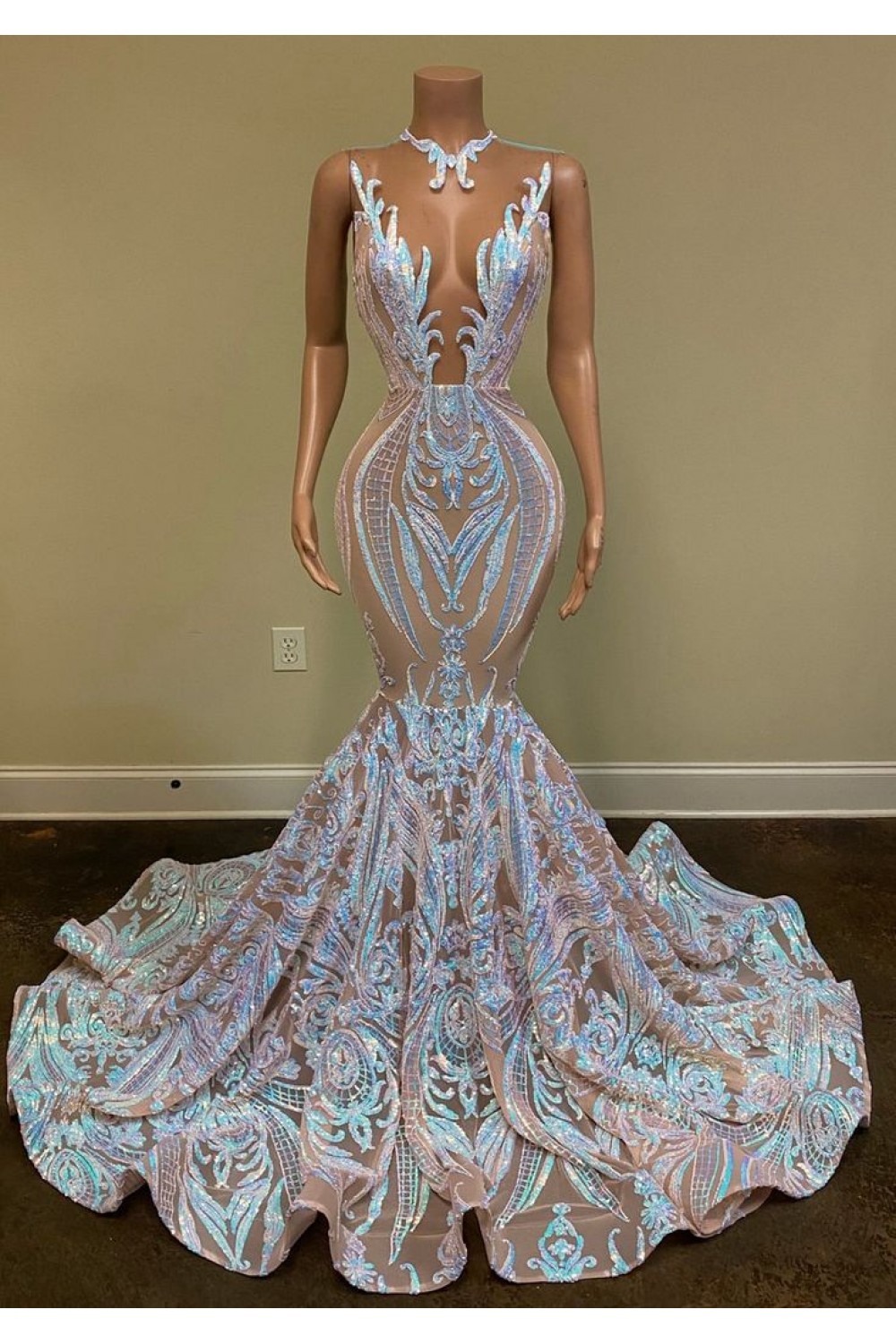 Mermaid Sleeveless Lace Long Prom Dresses 801456