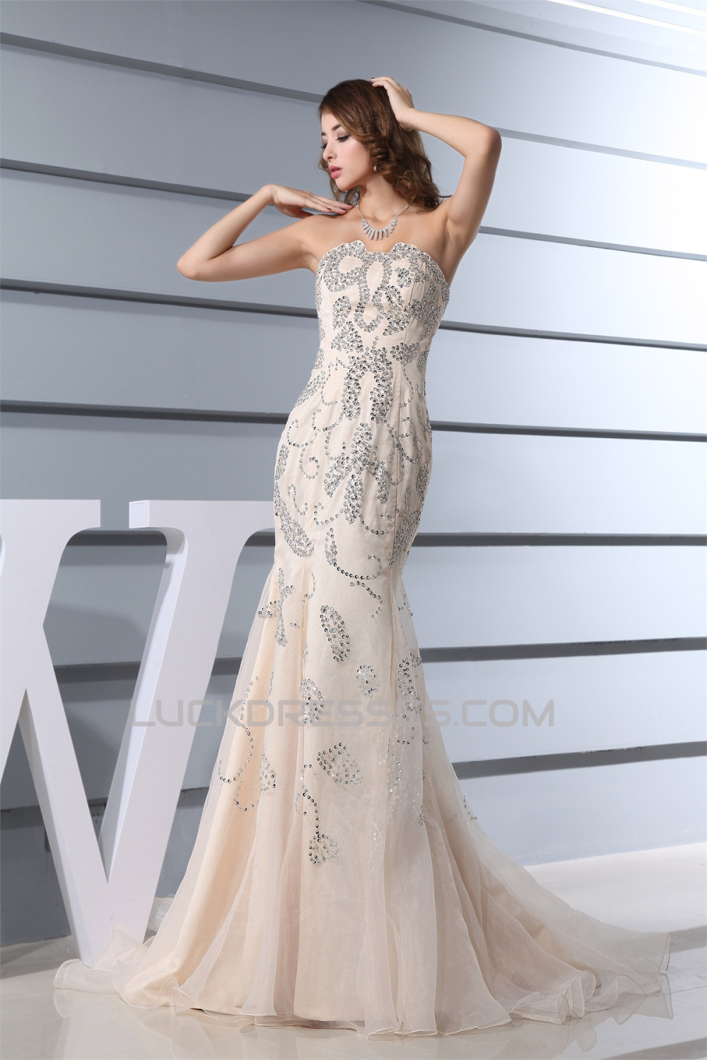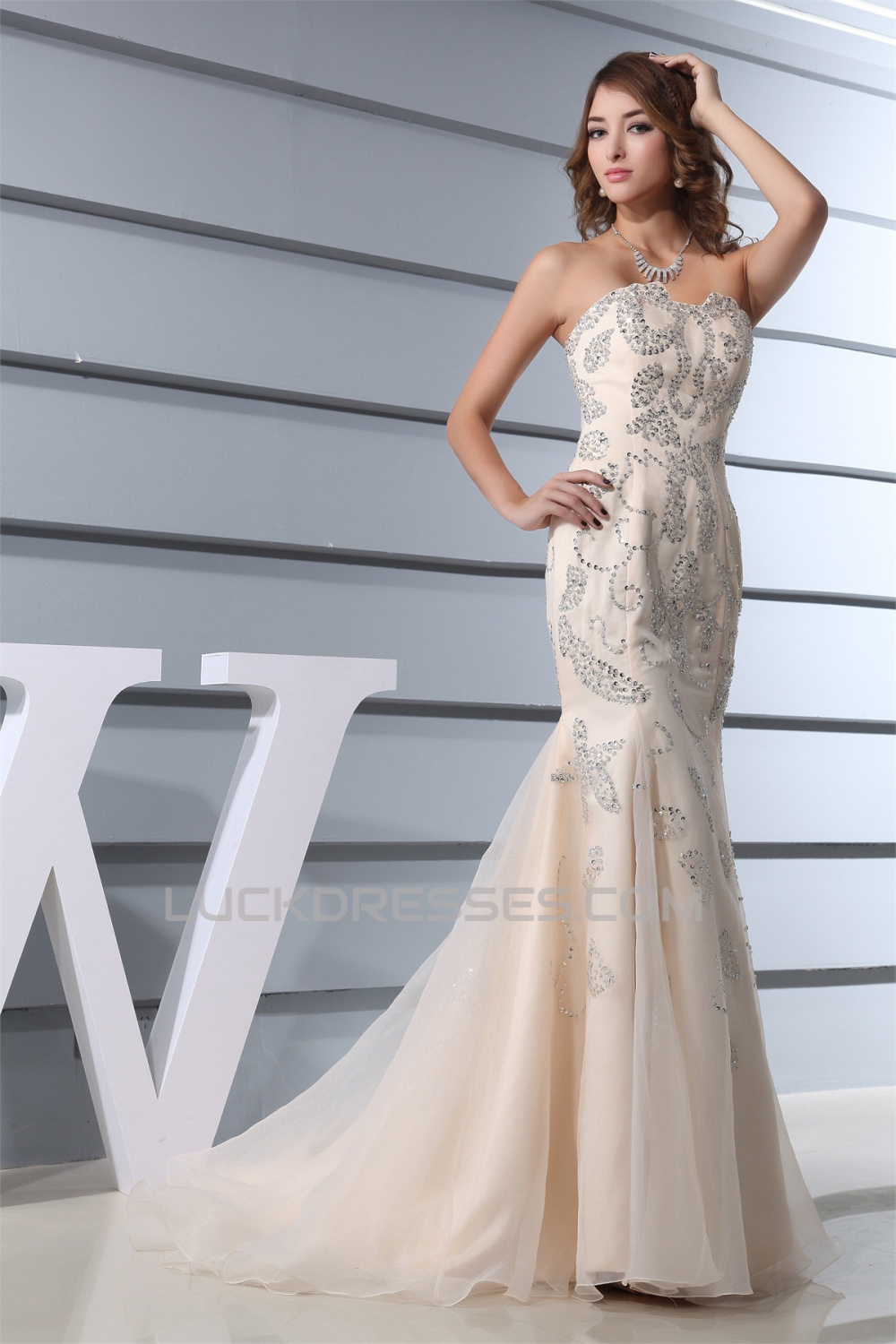 Mermaid/Trumpet Strapless Sleeveless Beaded Sequins Satin Organza Wedding Dresses 2030215