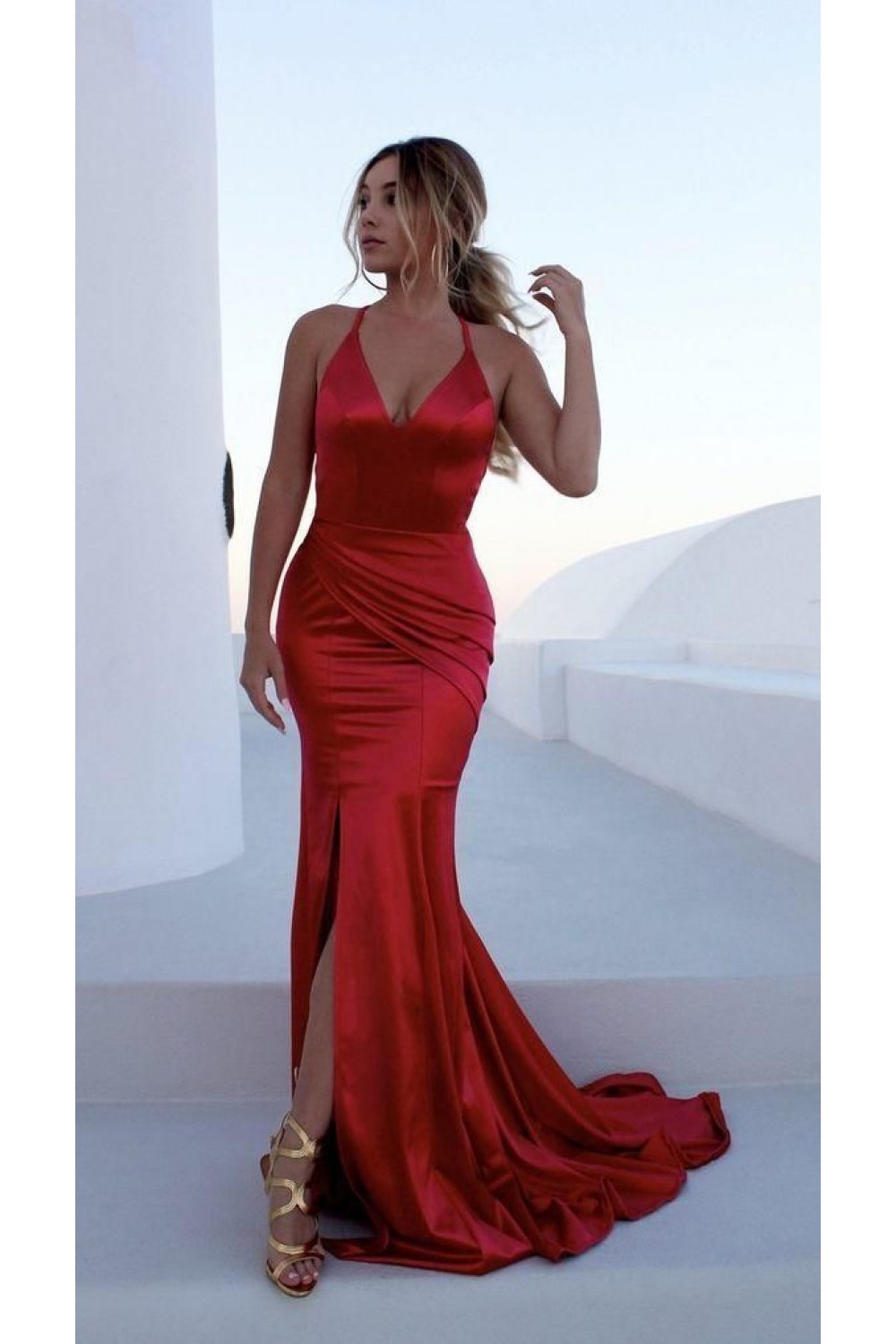 Mermaid V-Neck Long Red Prom Dress Formal Evening Dresses 601416