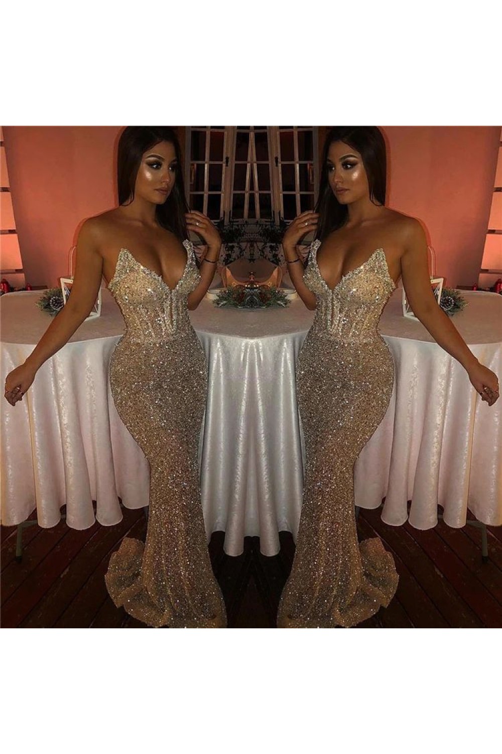 Mermaid V Neck Sequins Beaded Long Prom Dresses 801356