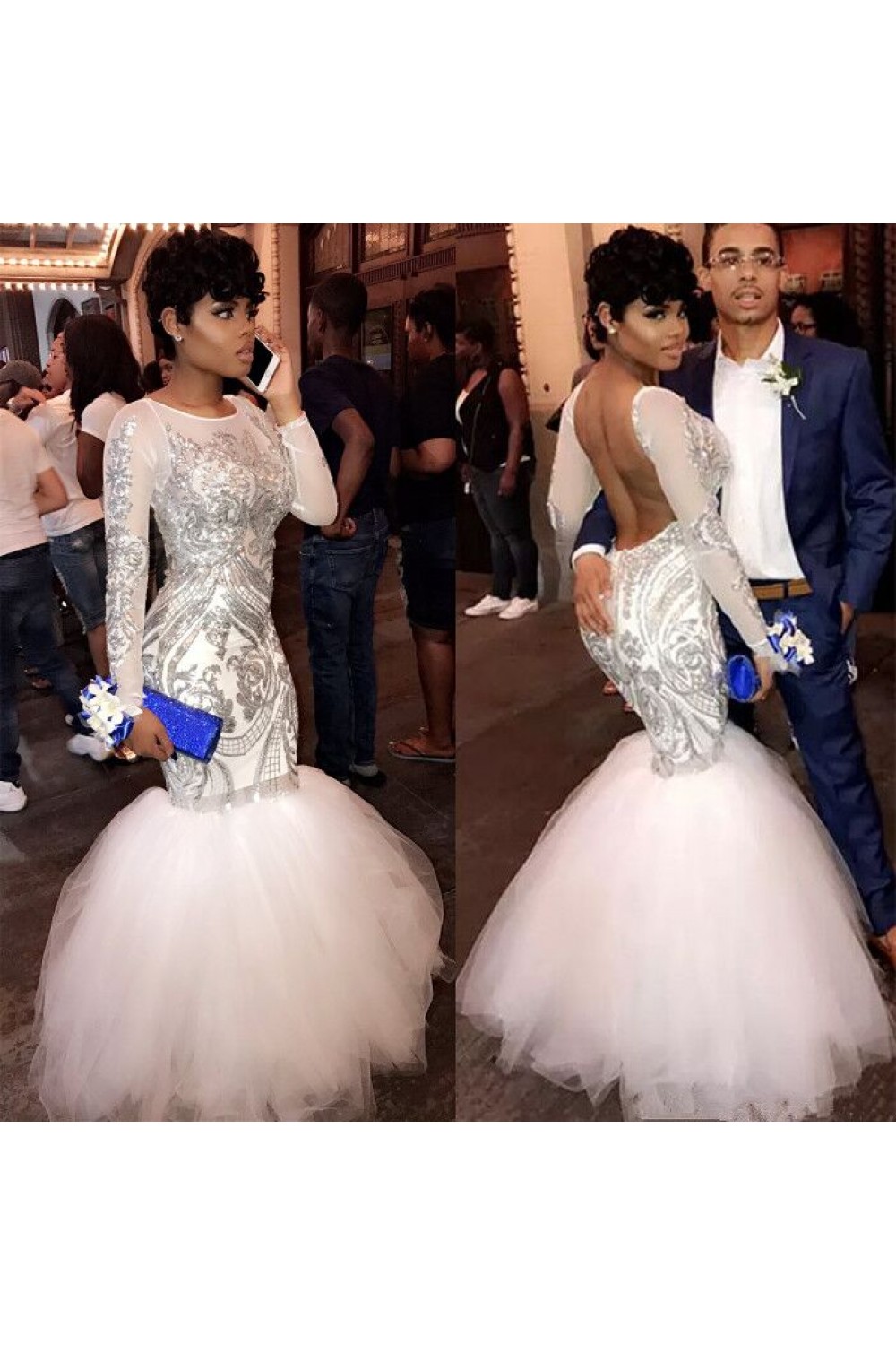 Mermaid White Backless Lace and Tulle Long Prom Dresses 801227