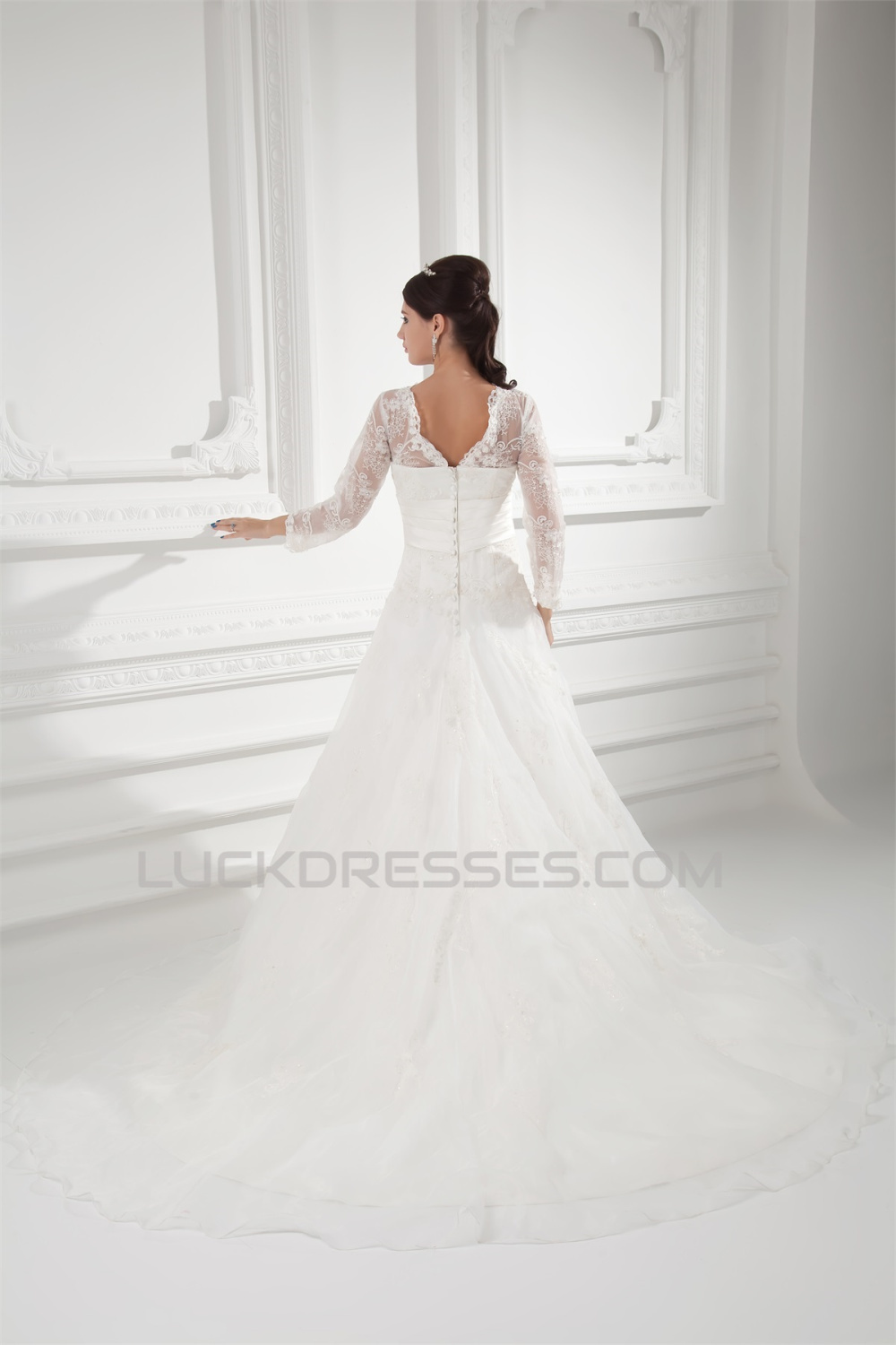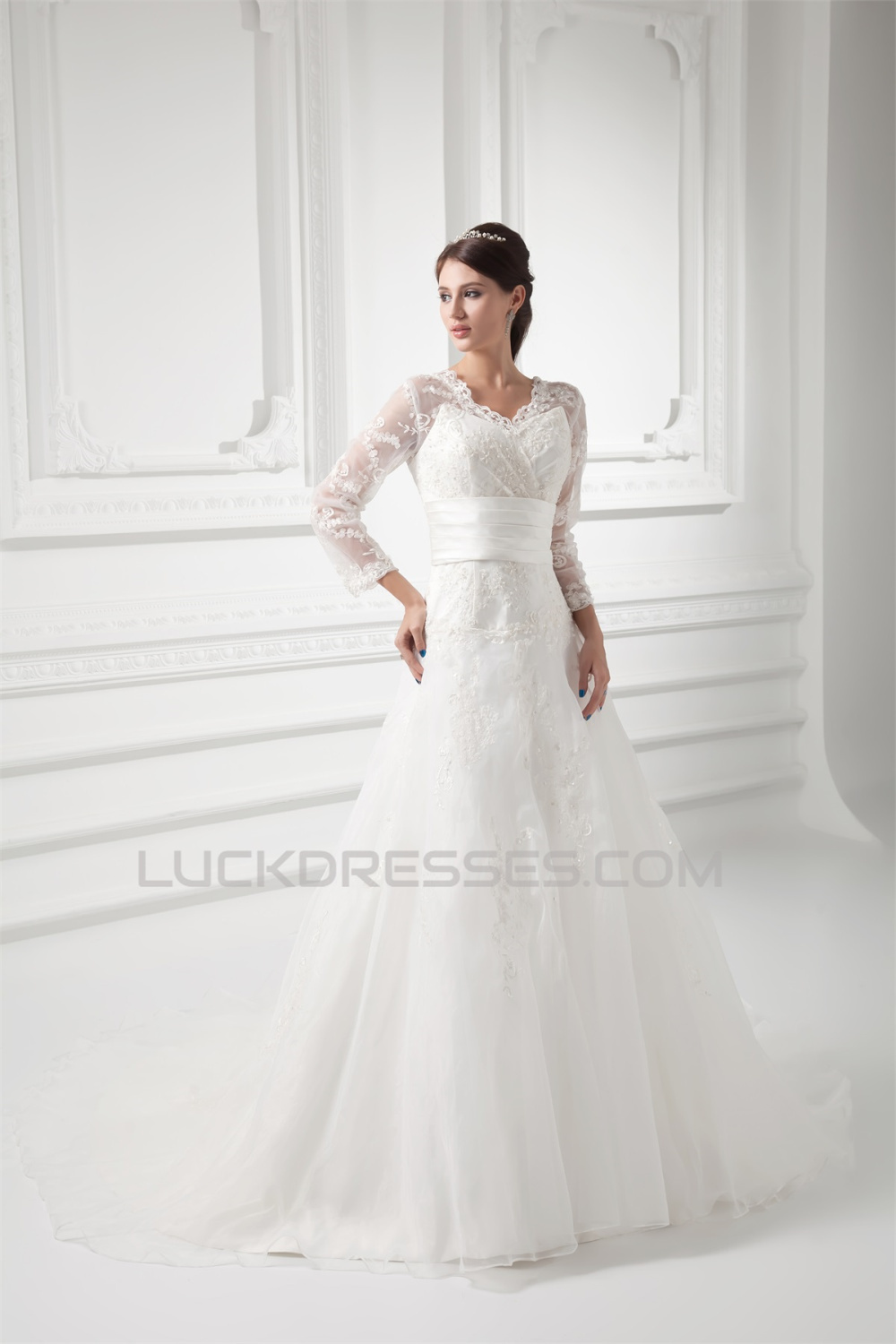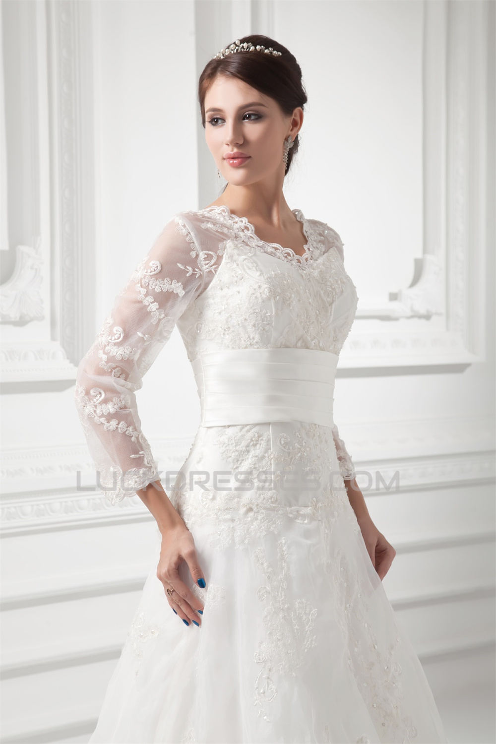 New Style A-Line Long Sleeve V-Neck Satin Organza Lace Wedding Dresses 2031258