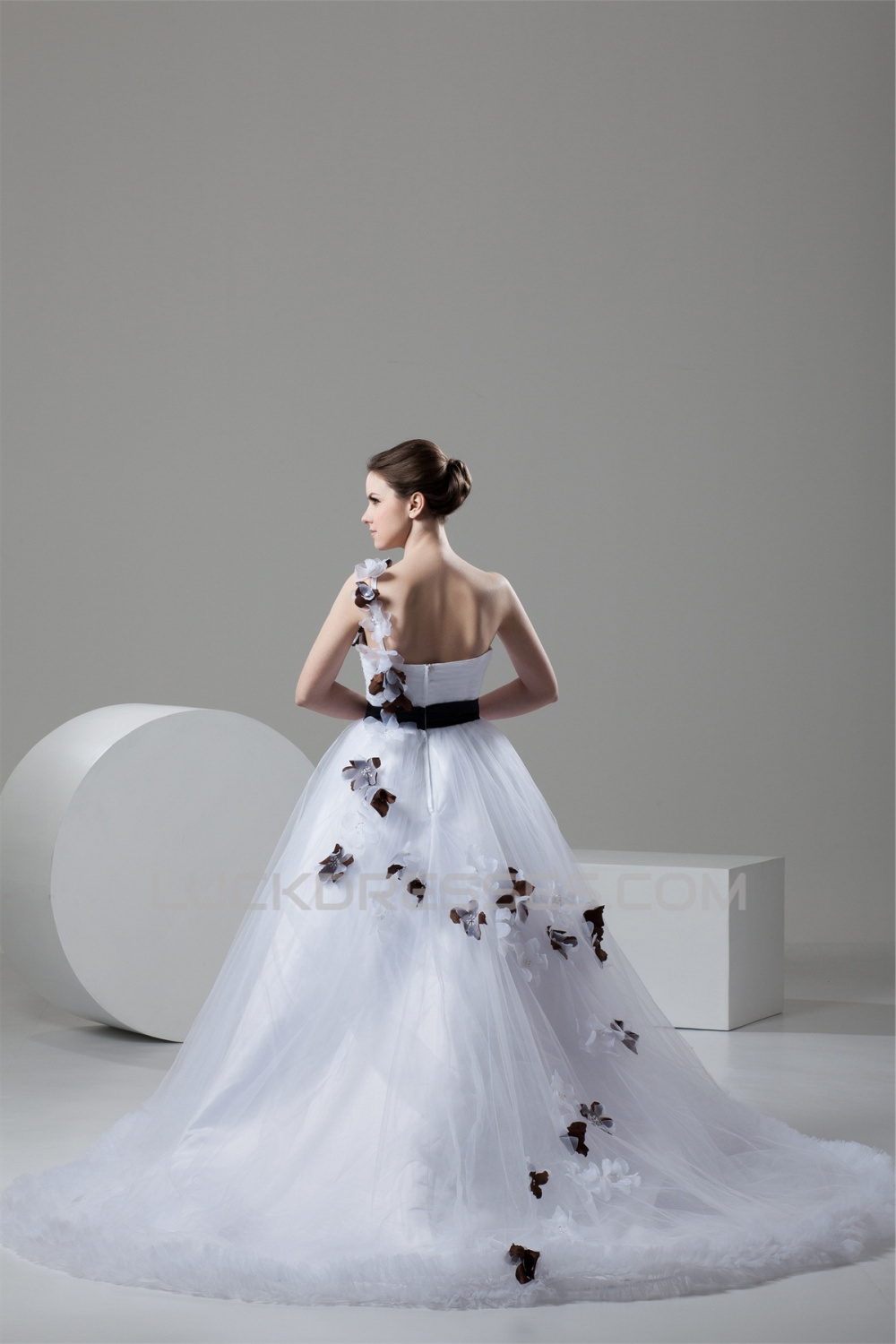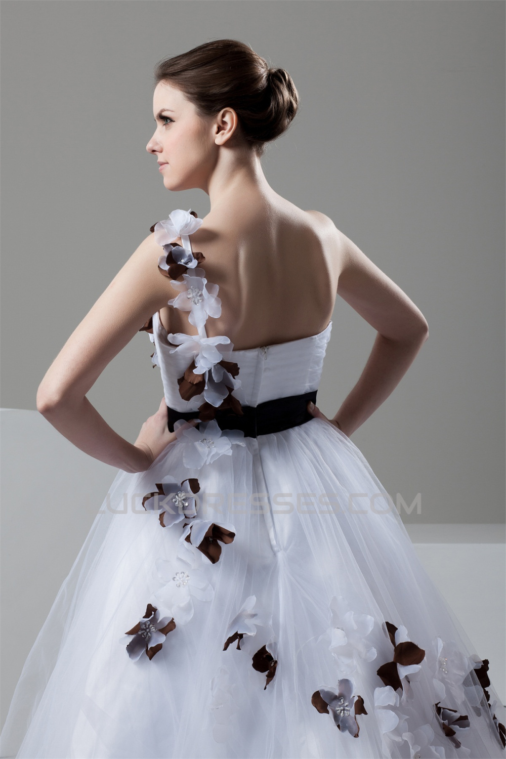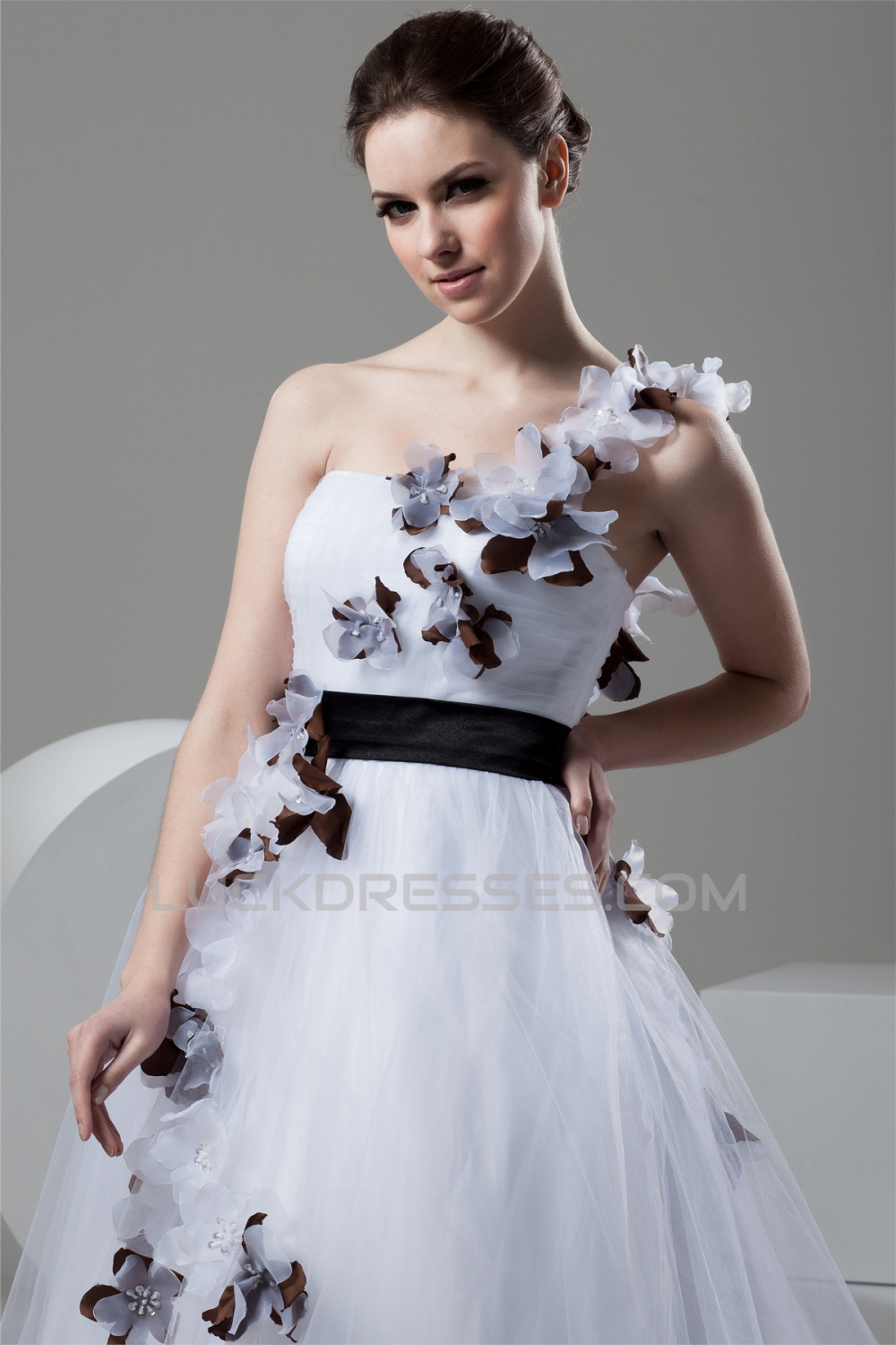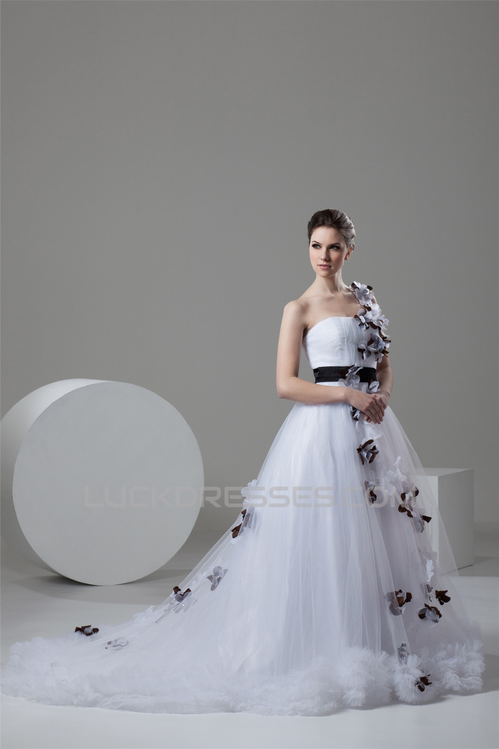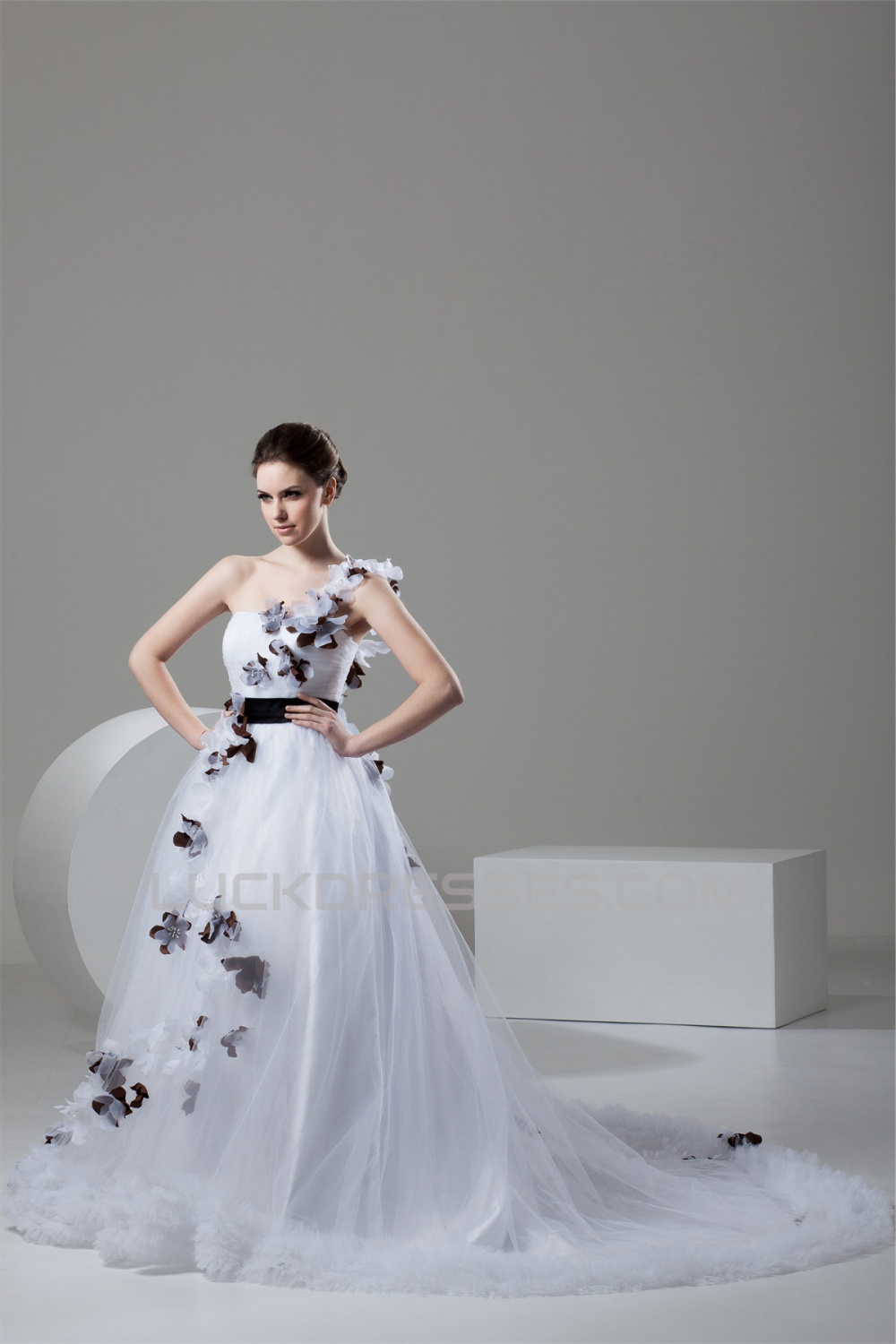 One-Shoulder A-Line Sleeveless Satin Fine Netting Sweet Wedding Dresses 2030811
