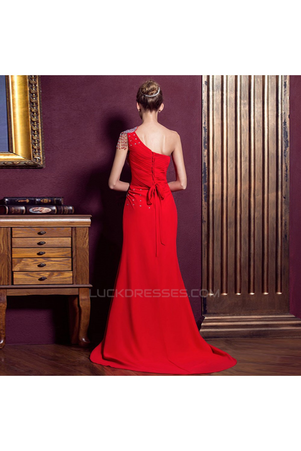 One-Shoulder Beaded Long Red Chiffon Prom Evening Formal Dresses ED011291