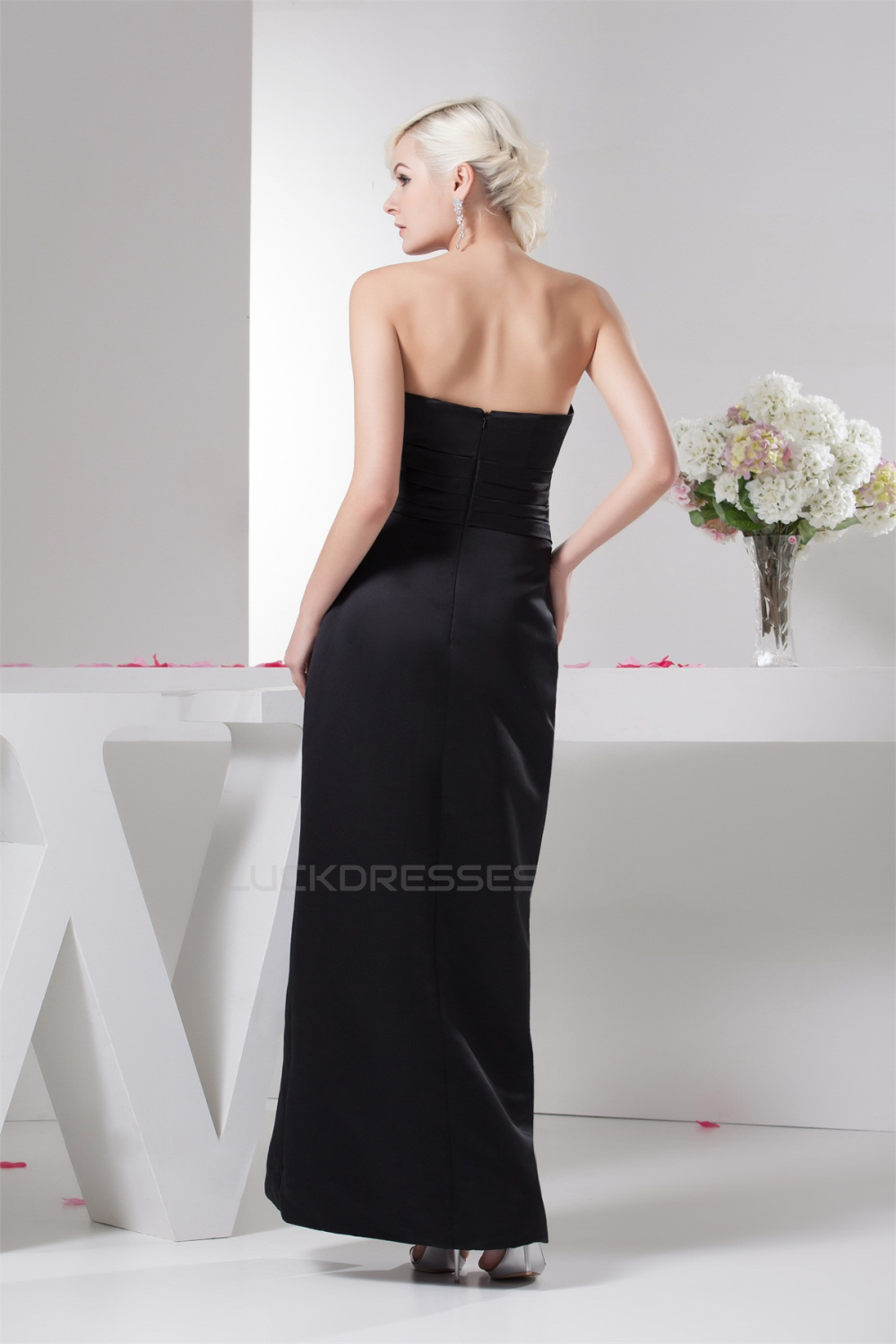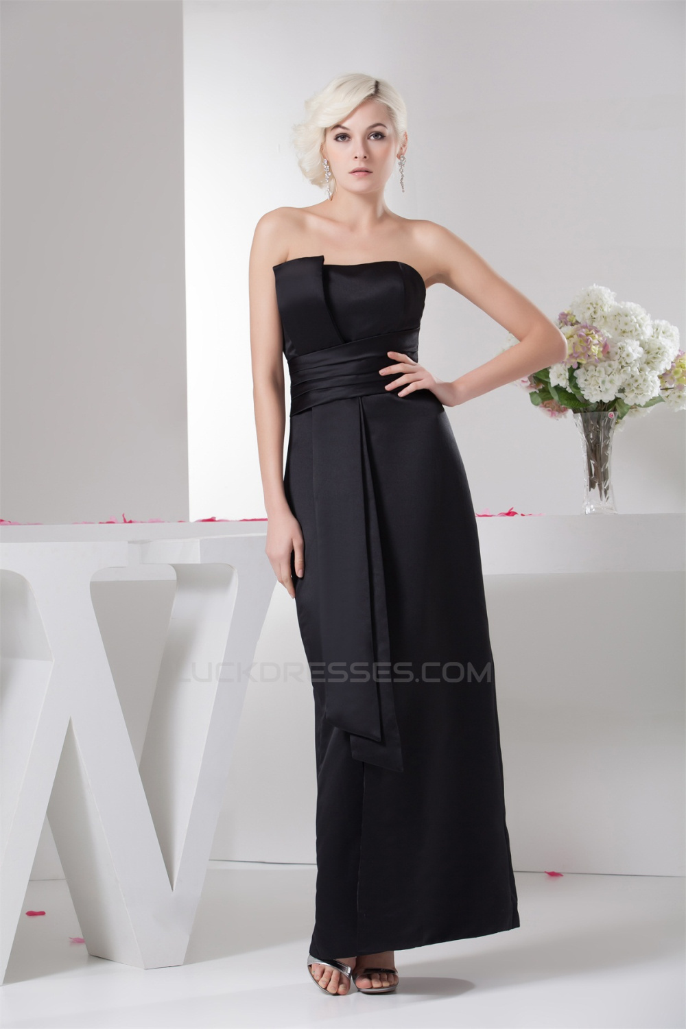 Pleats Satin Strapless Sleeveless Long Black Bridesmaid Dresses 02010104