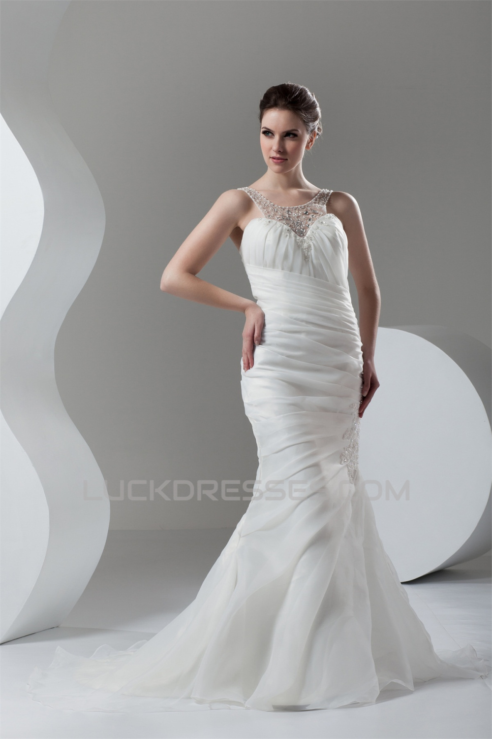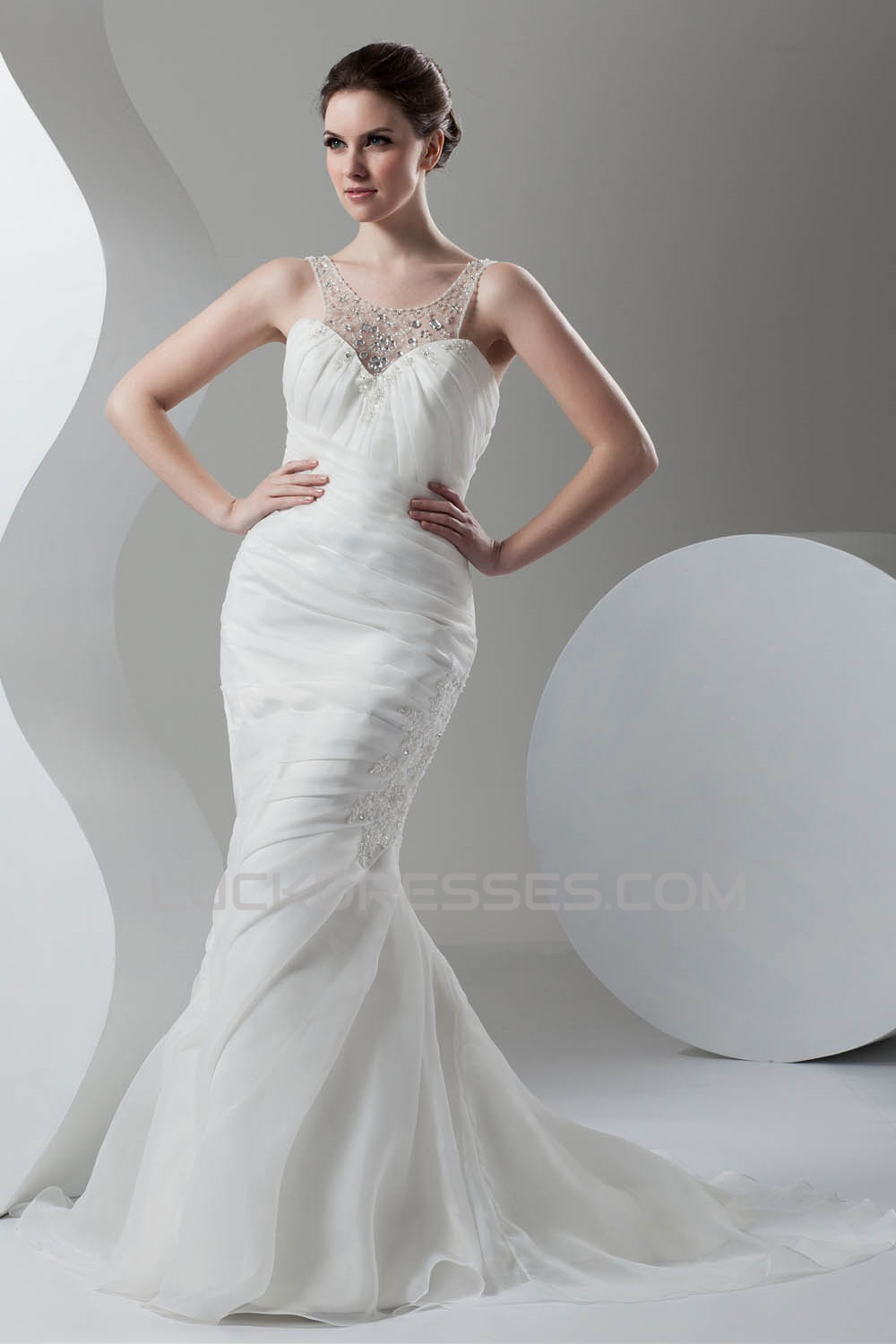 Satin Organza Scoop Sleeveless Mermaid/Trumpet Beaded Wedding Dresses 2030865