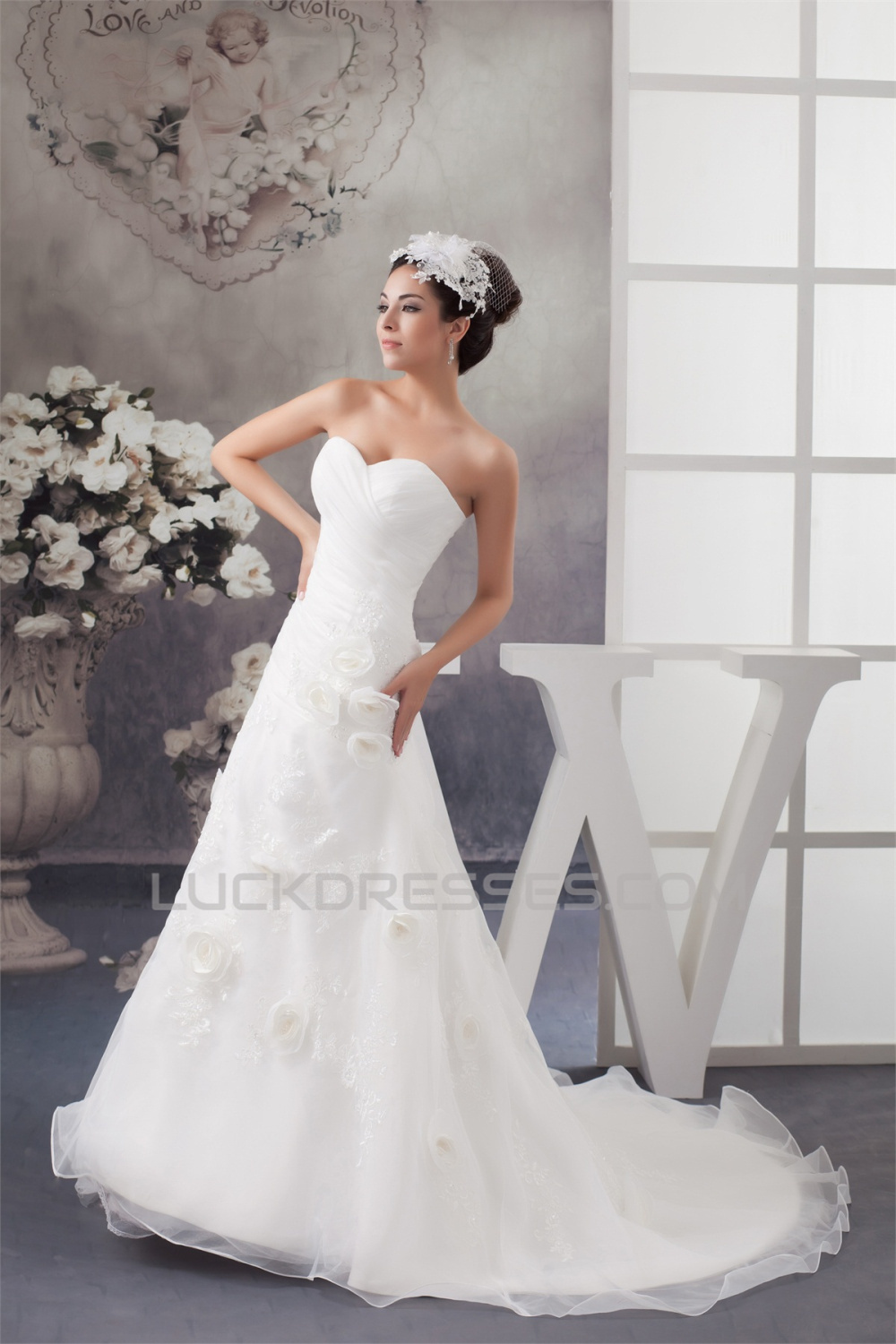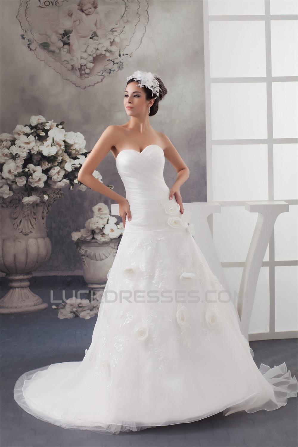Satin Sleeveless Sweetheart A-Line Lace Wedding Dresses 2030875
