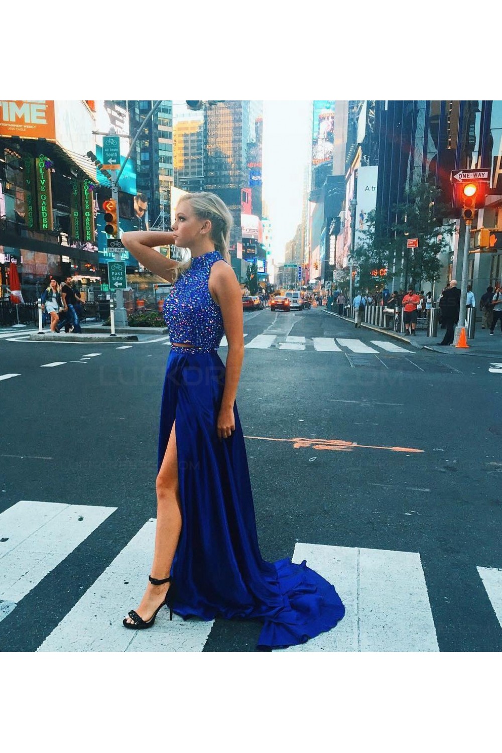 Sexy Beaded Blue Long Prom Dresses Party Evening Gowns with Slit 3020432