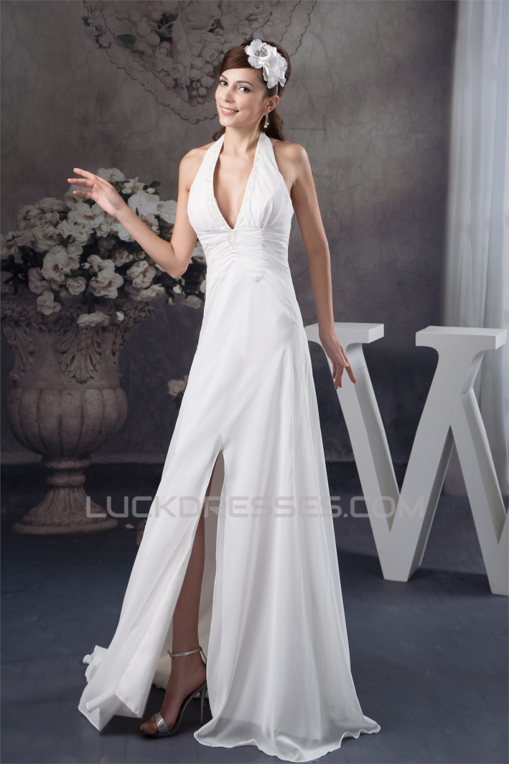 -50% Sheath/Column Halter Chiffon Brush Sweep Train Beaded Wedding Dresses 2030920
