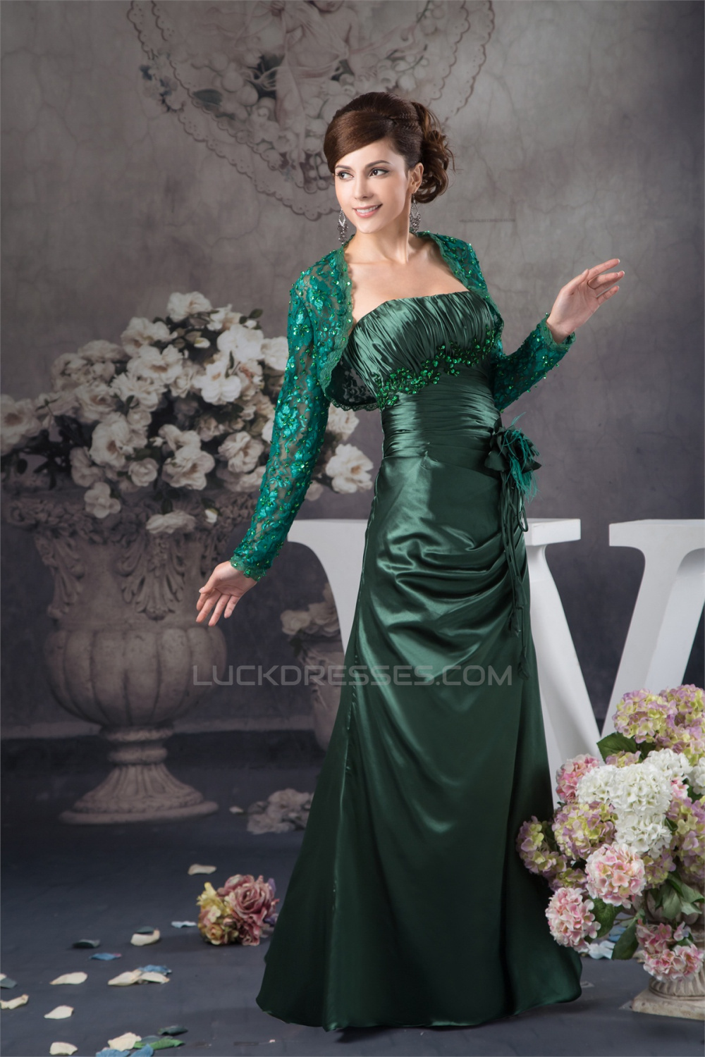 Sheath/Column Handmade Flowers Mother of the Bride Dresses with A Long Sleeves Lace Jacket 2040133