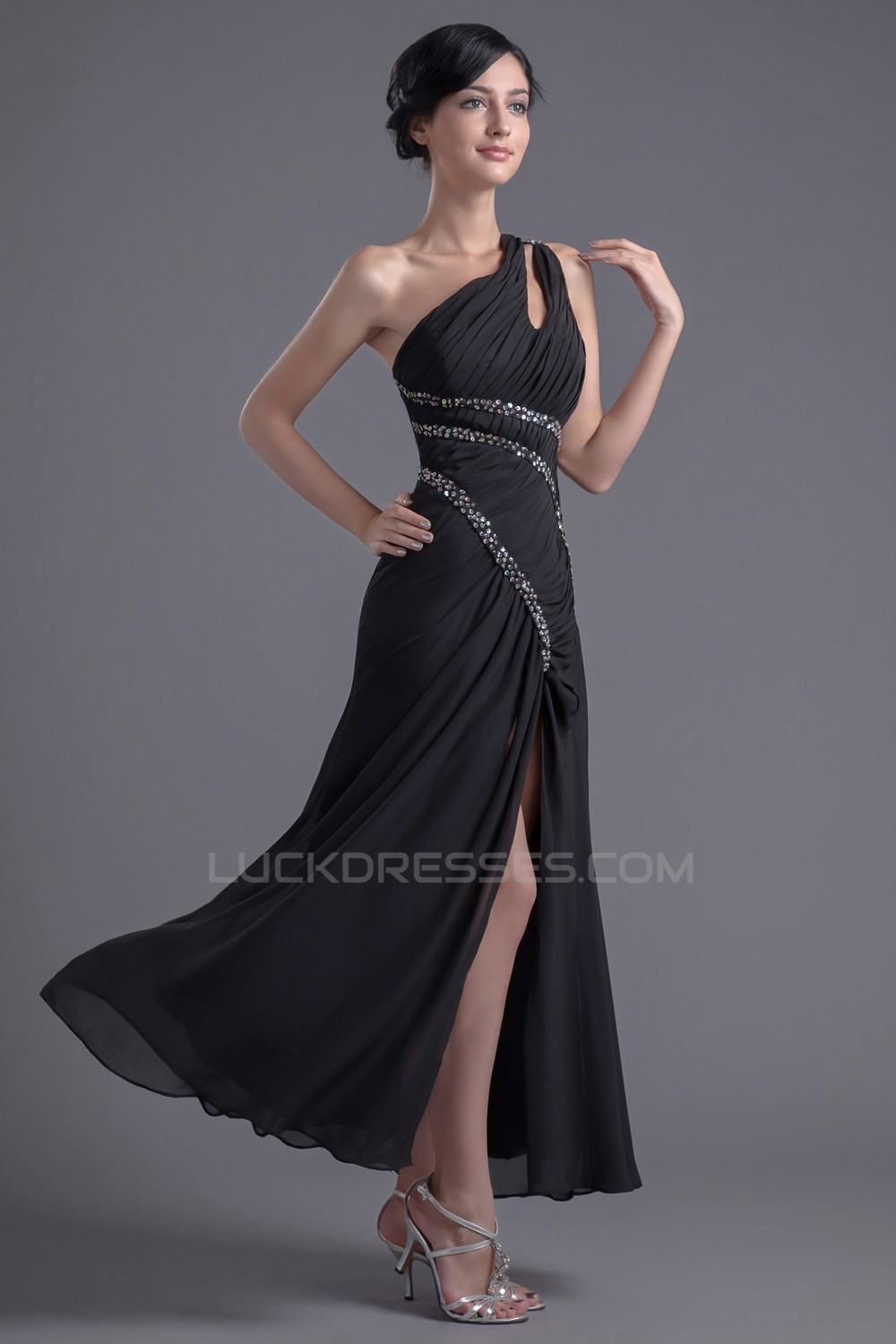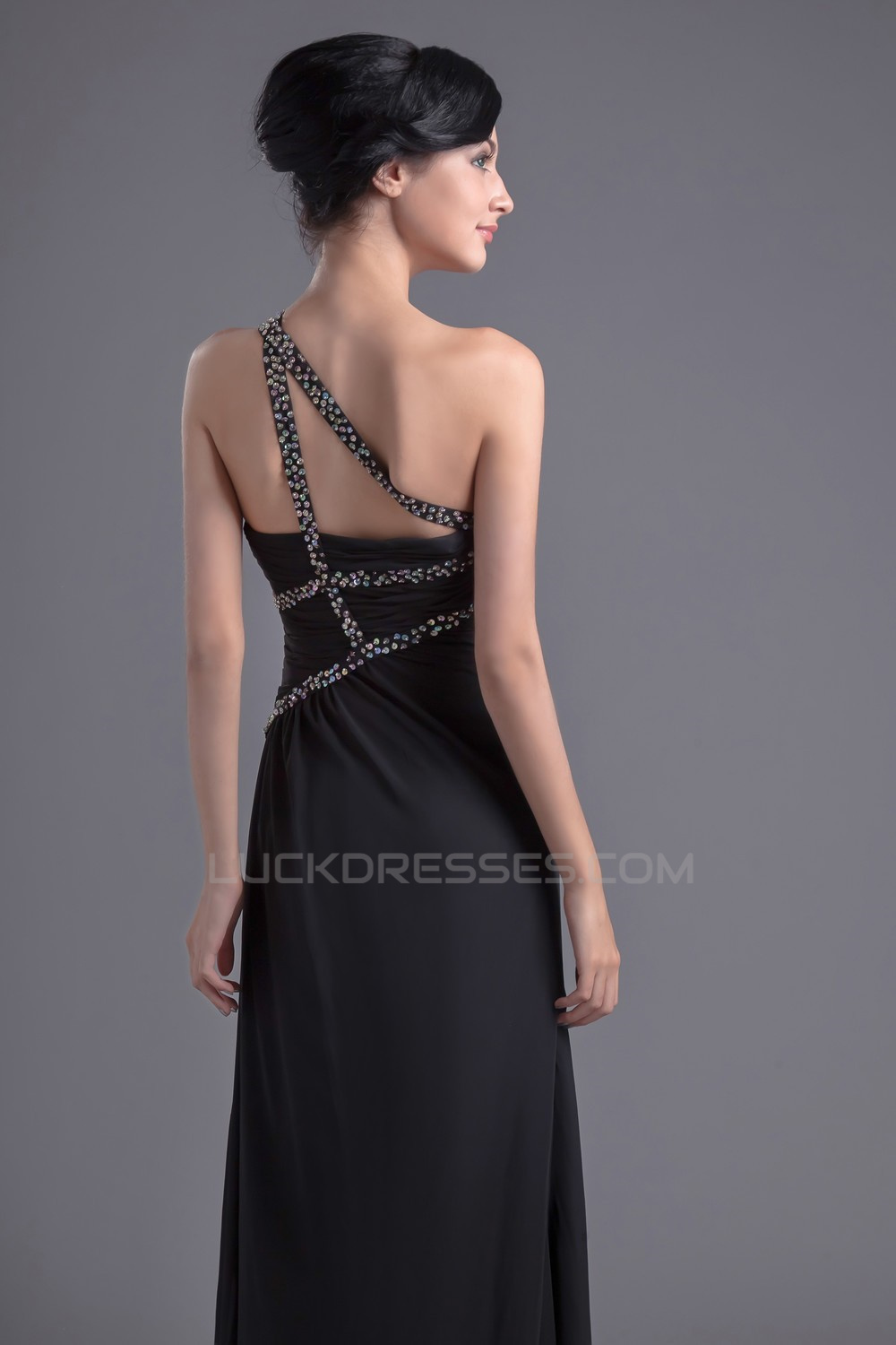 Sheath/Column One-Shoulder Beaded Long Black Chiffon Prom Evening Formal Dresses ED011389