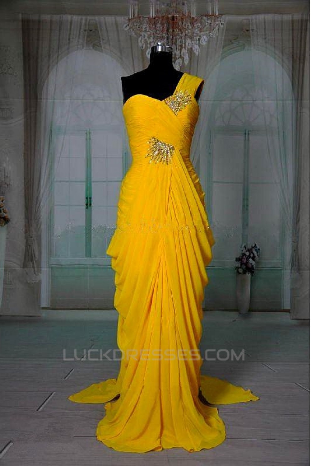 Sheath/Column One-Shoulder Beaded Long Chiffon Prom Evening Formal Dresses ED011416