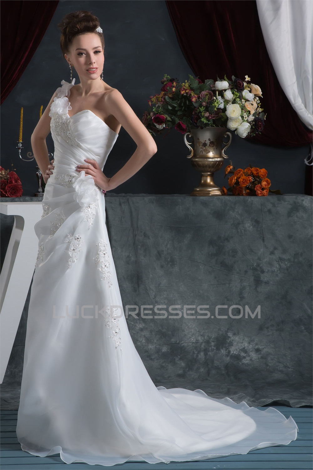 Sheath/Column One-Shoulder Satin Organza Beautiful Beaded Lace Wedding Dresses 2030872