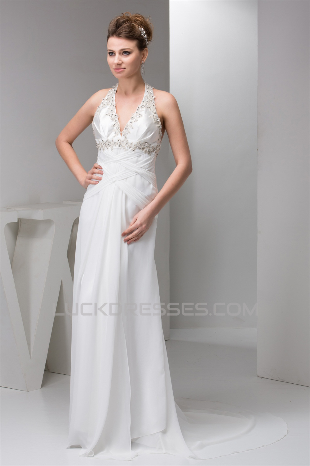 Sheath/Column Sleeveless Chiffon Halter Beaded Wedding Dresses 2030900