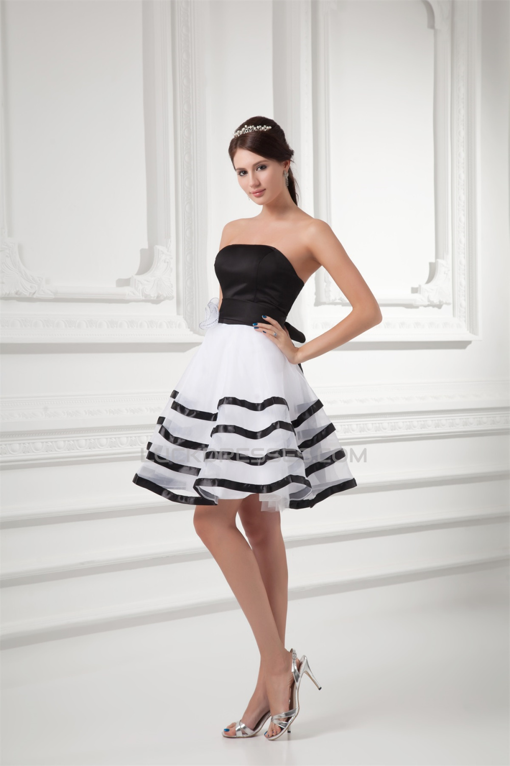Short/Mini A-Line Satin Organza Handmade Flowers Black White Bridesmaid Dresses 02010517