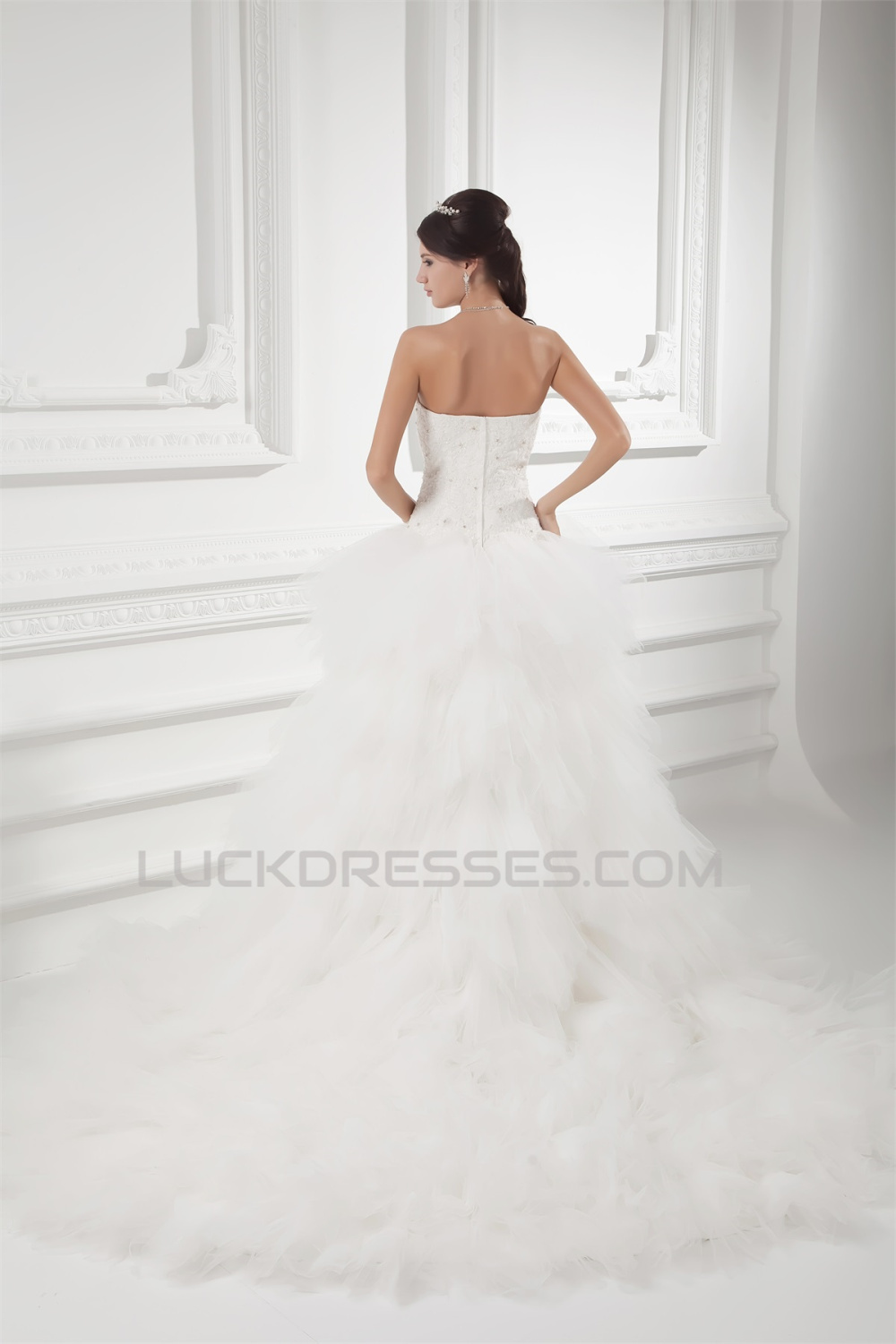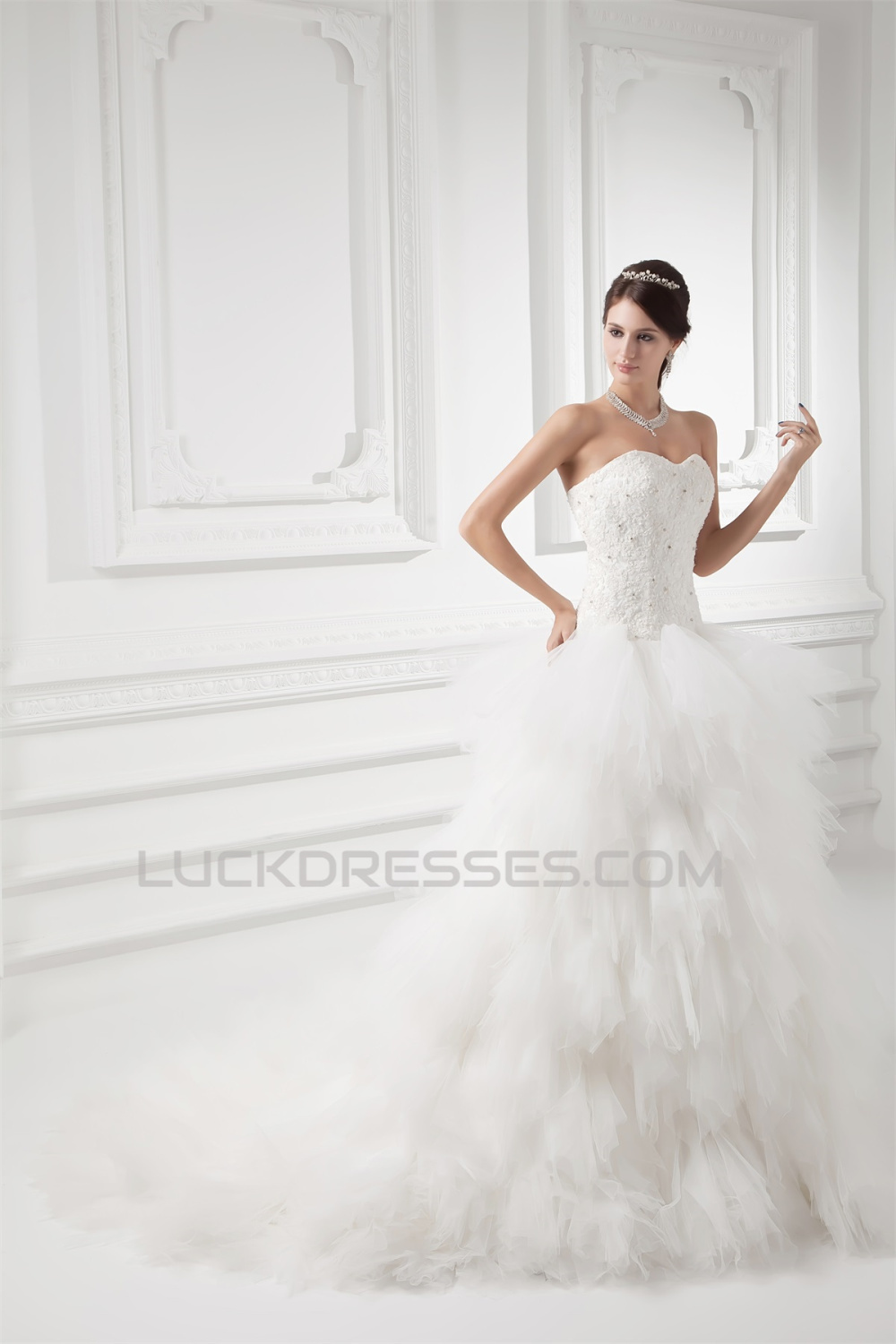 Sleeveless A-Line Strapless Satin Fine Netting Beaded Lace Wedding Dresses 2031315