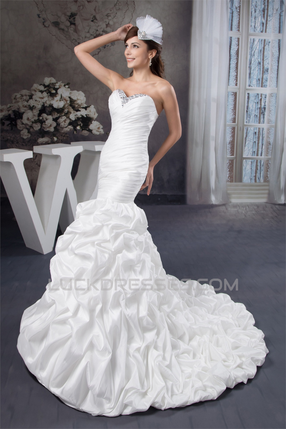Sweetheart Mermaid/Trumpet Sleeveless Satin Taffeta Beaded Wedding Dresses 2031018