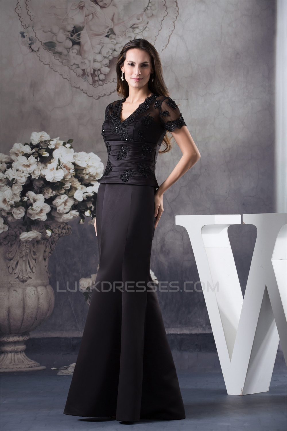 Trumpet/Mermaid Floor-Length V-Neck Ruffles Short Sleeve Appliques Mother of the Bride Dresses 2040042