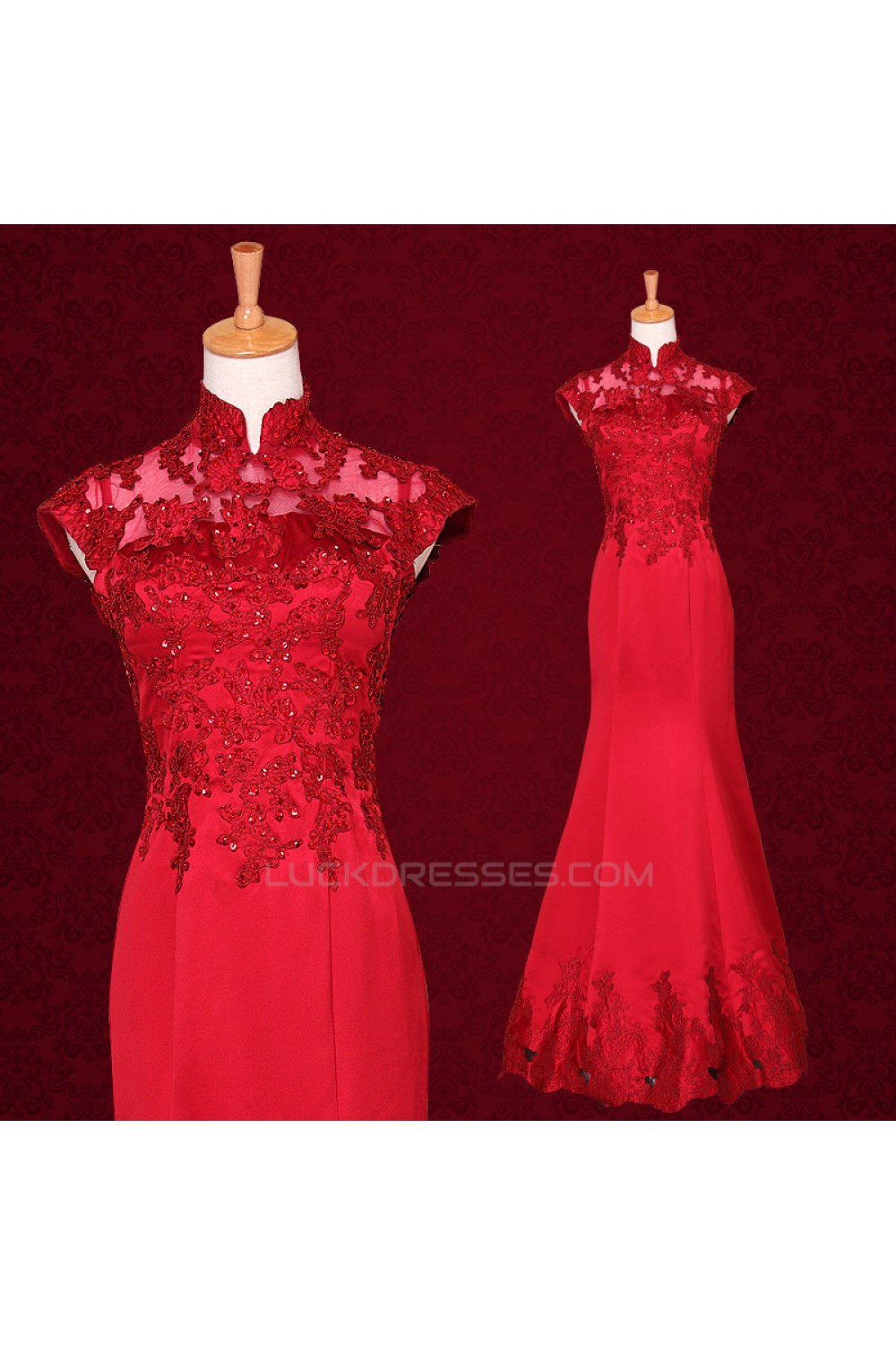 Trumpet/Mermaid High-Neck Beaded Applique Long Red Prom Evening Formal Dresses ED011346