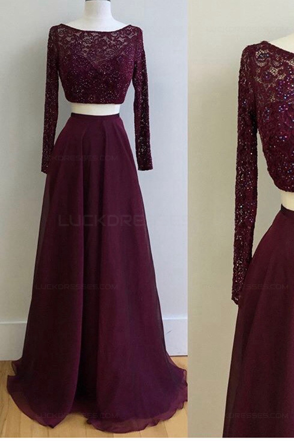 Two Pieces Long Sleeves Lace Chiffon Prom Dresses Party Evening Gowns 3020324