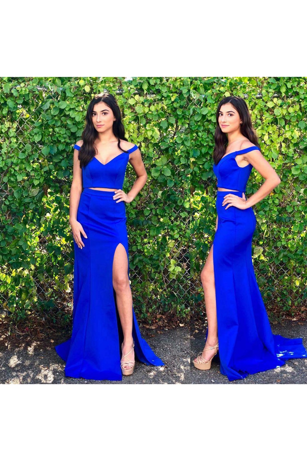 Two Pieces Off-the-Shoulder Long Blue Prom Dresses Formal Evening Dresses 601096